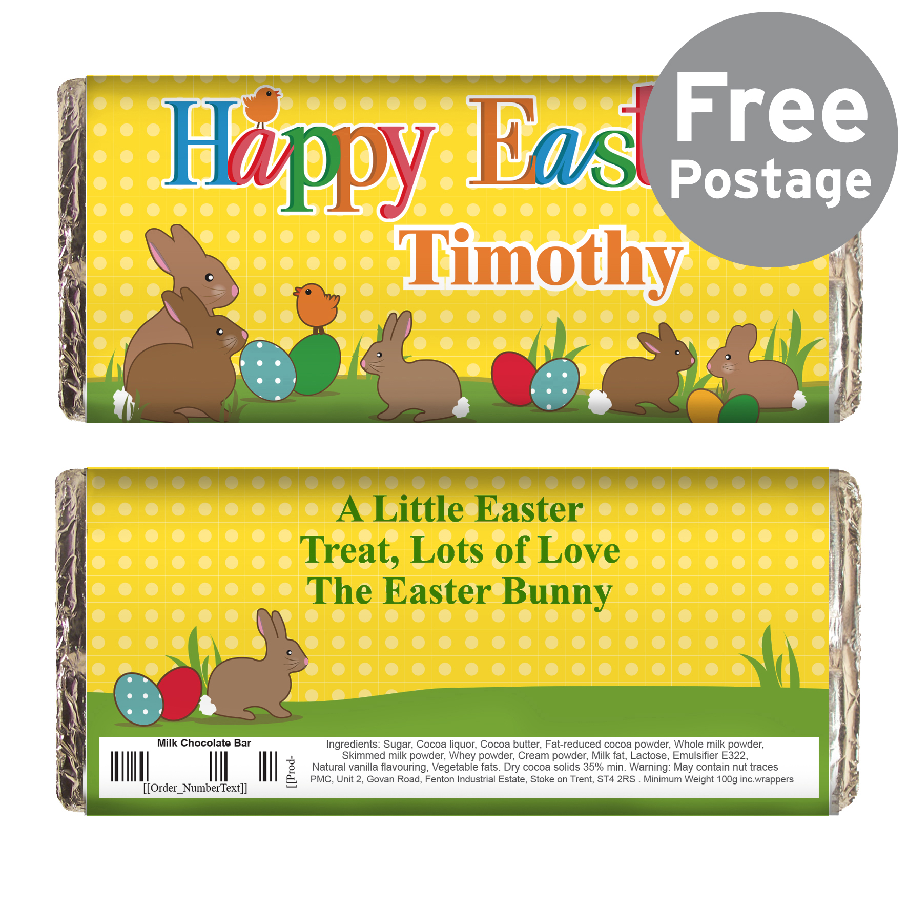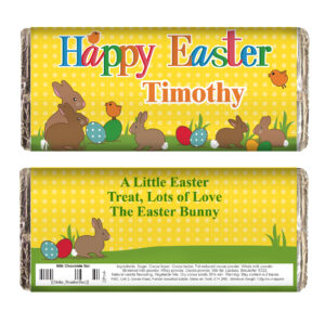 Personalise this Easter Bunny Chocolate Bar with a name of up to 12 characters on the front and on the back over 3 lines of 25 characters each.