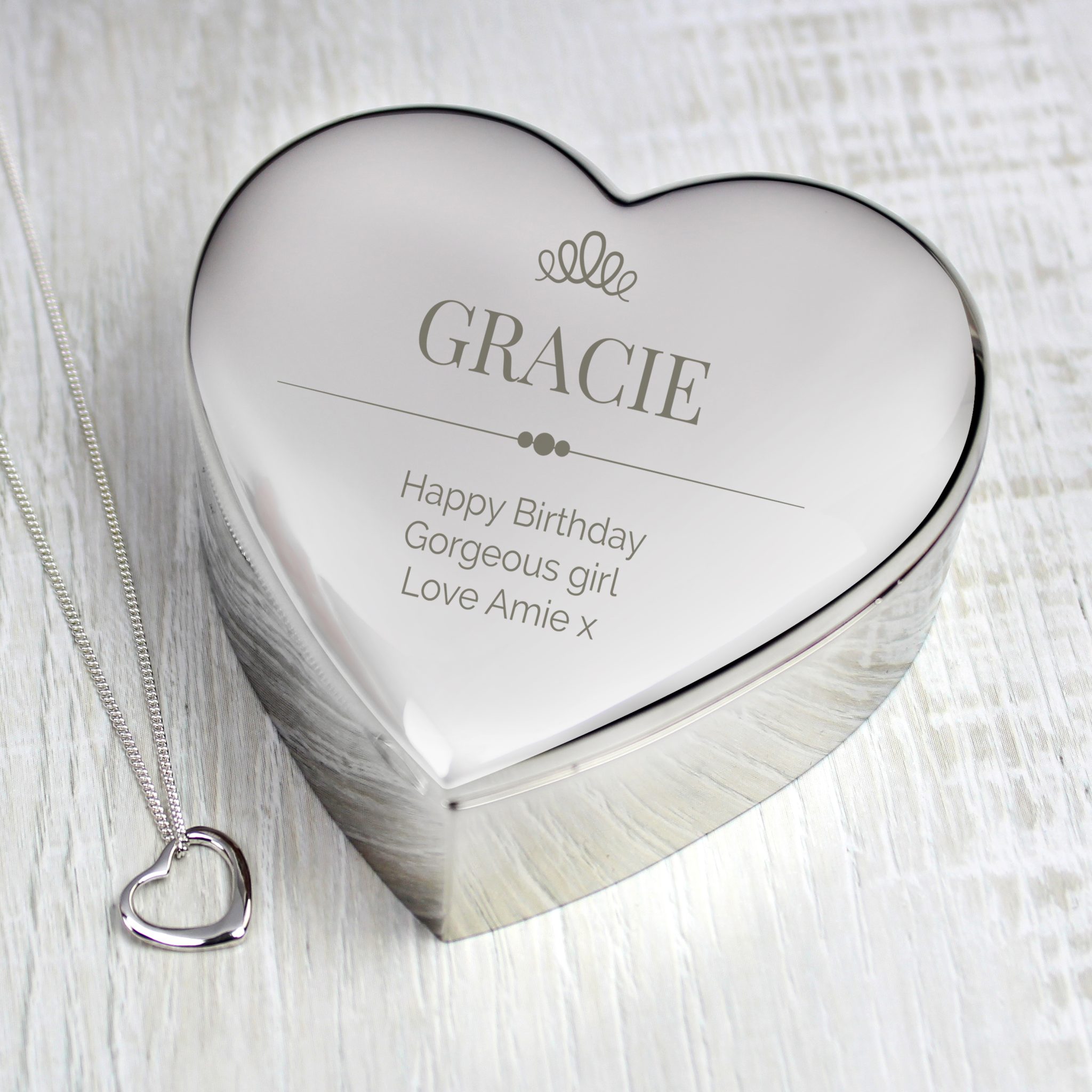- The heart trinket box can be personalised with a name up to 12 characters long and with 3 lines of text, with up to 20 characters per line.