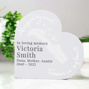 This beautiful feather free standing heart is a lovely way to commentate the life of a loved one.