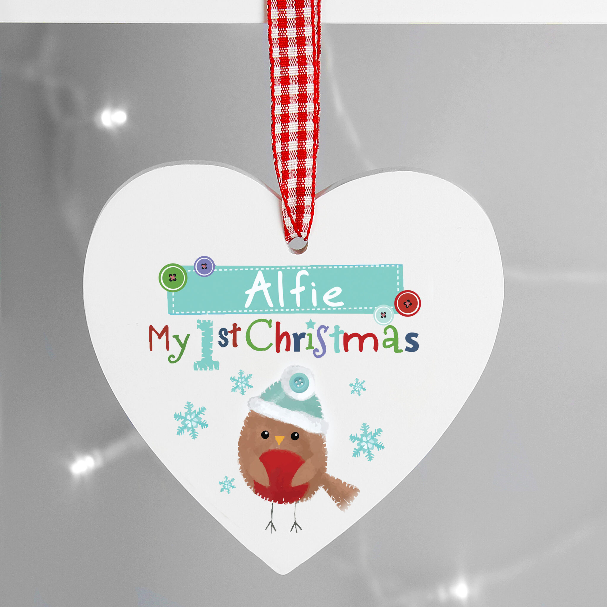 Personalised Felt Stitch Robin My 1st Christmas Wooden Heart Decoration