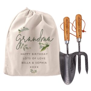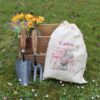 Personalise this heavy-duty gardening tool set with a name using a maximum of 15 characters and a message below over 4 lines of 20 characters. The sturdy trowel and fork are produced by ‘Draper Tools’ and are made from quality carbon steel. They each feature lacquered ash handles which are finished off with handy wrist straps, both are engraved with your chosen name before the fixed Text ‘trowel’ and ‘fork’ for example ‘Mum’s Trowel’ and ‘Mum’s Fork’. Dimensions: Trowel: 32cm long, 8cm wide. Fork:29cm long, 7.5cm wide. Drawstring bag: 35 x 25cm.