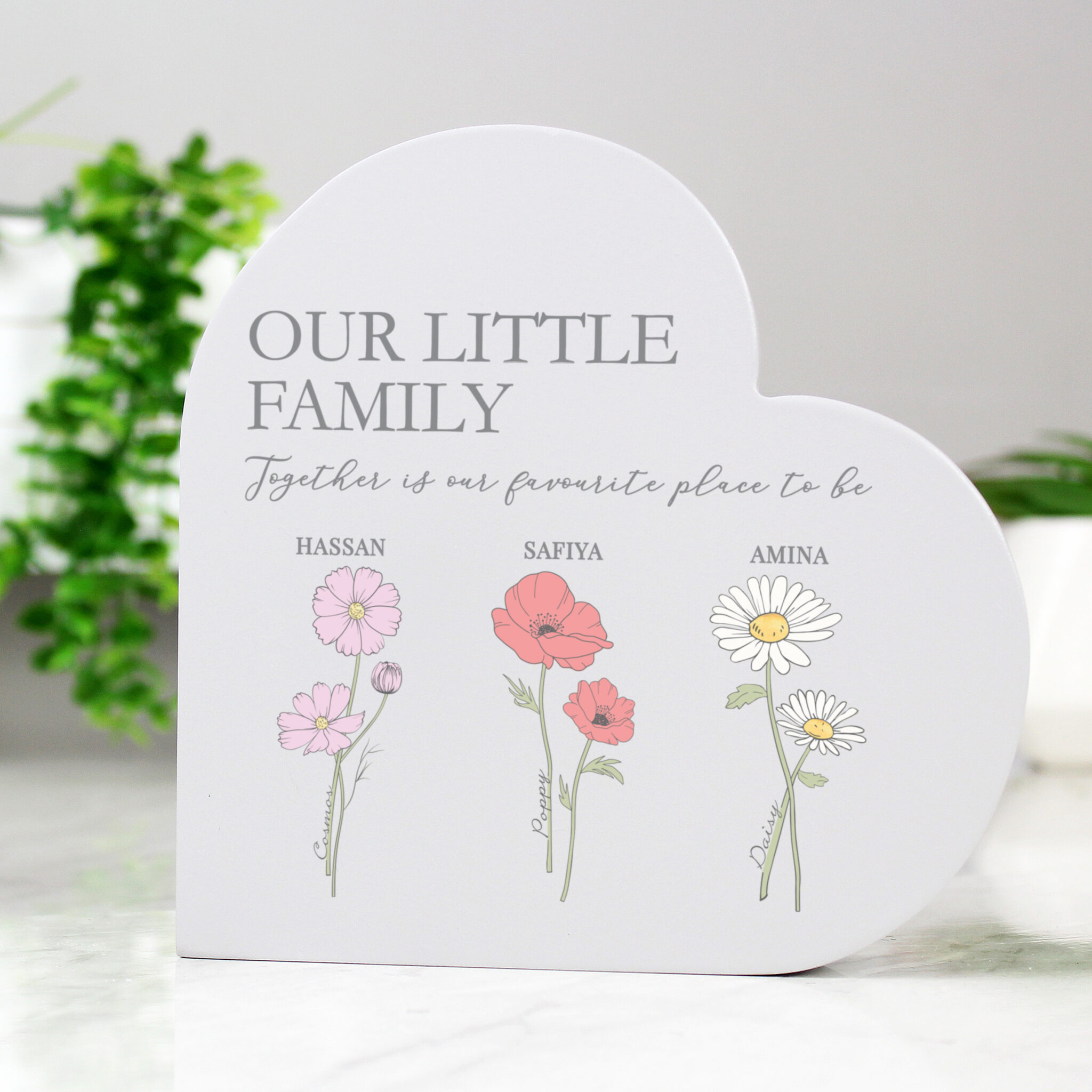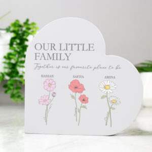 - This unique grey heart ornament can be personalised with 3 message lines along the top and then up to 6 flowers below, each with a name underneath. *The first two flowers and names are mandatory.