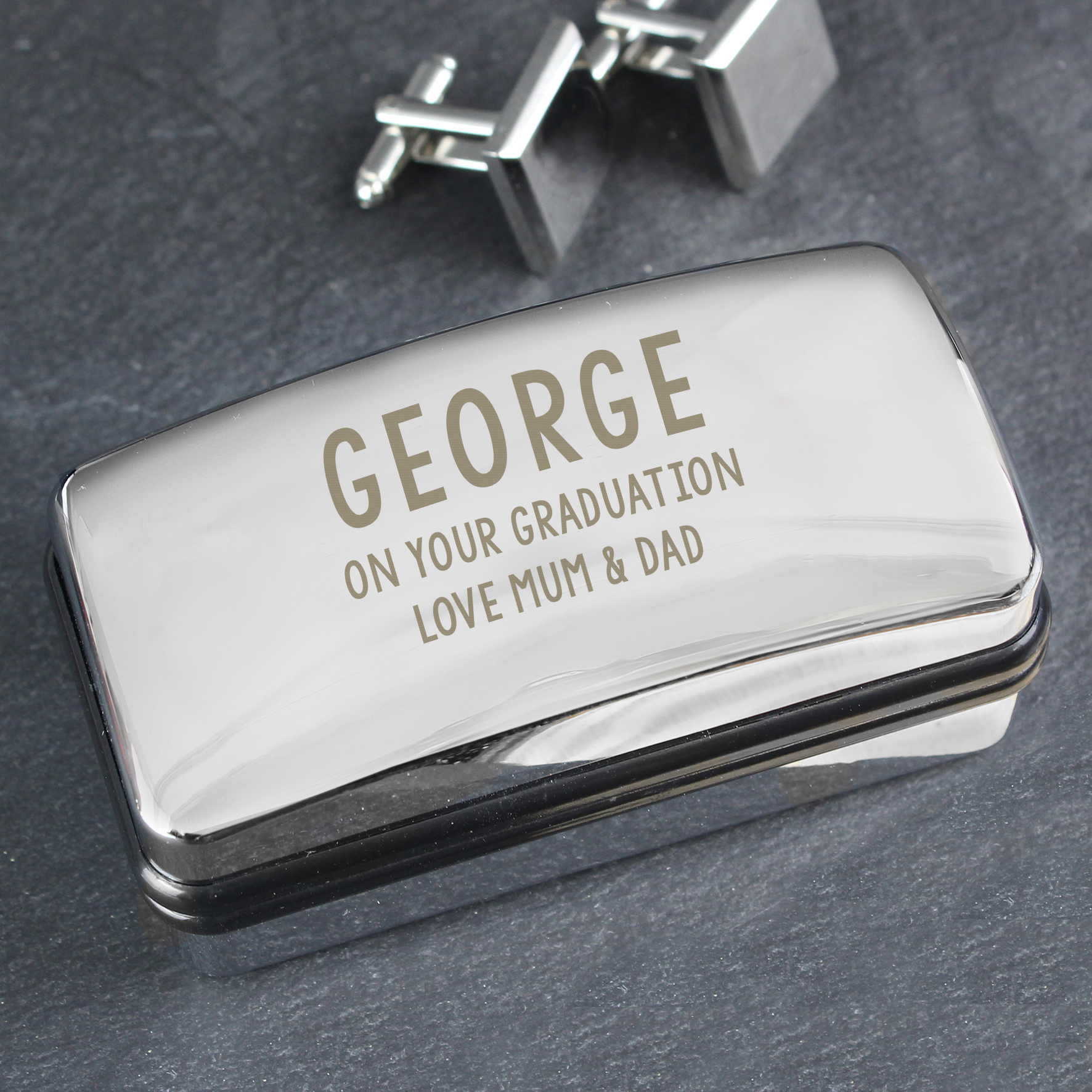 - The cufflink box can be personalised with a name up to 12 characters long and 2 messages lines, both lines have up to 25 characters available.
