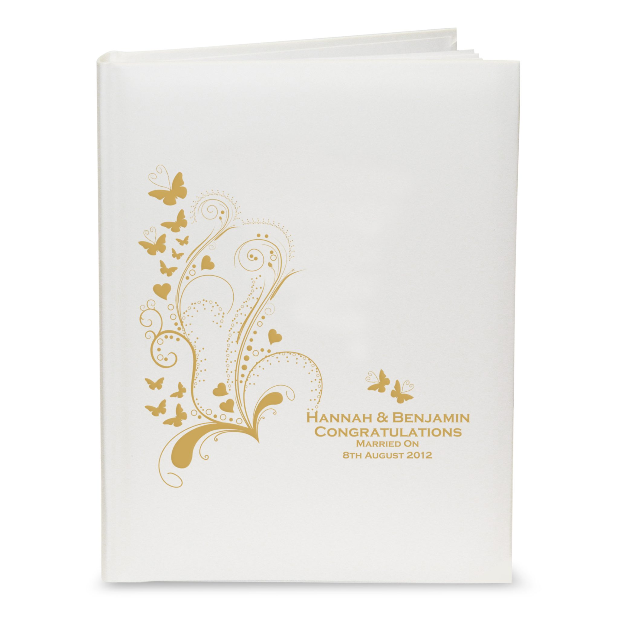 This Gold Butterfly Swirl Traditional Album can be personalised with any message of your choice over 4 lines up to 25 characters per line.