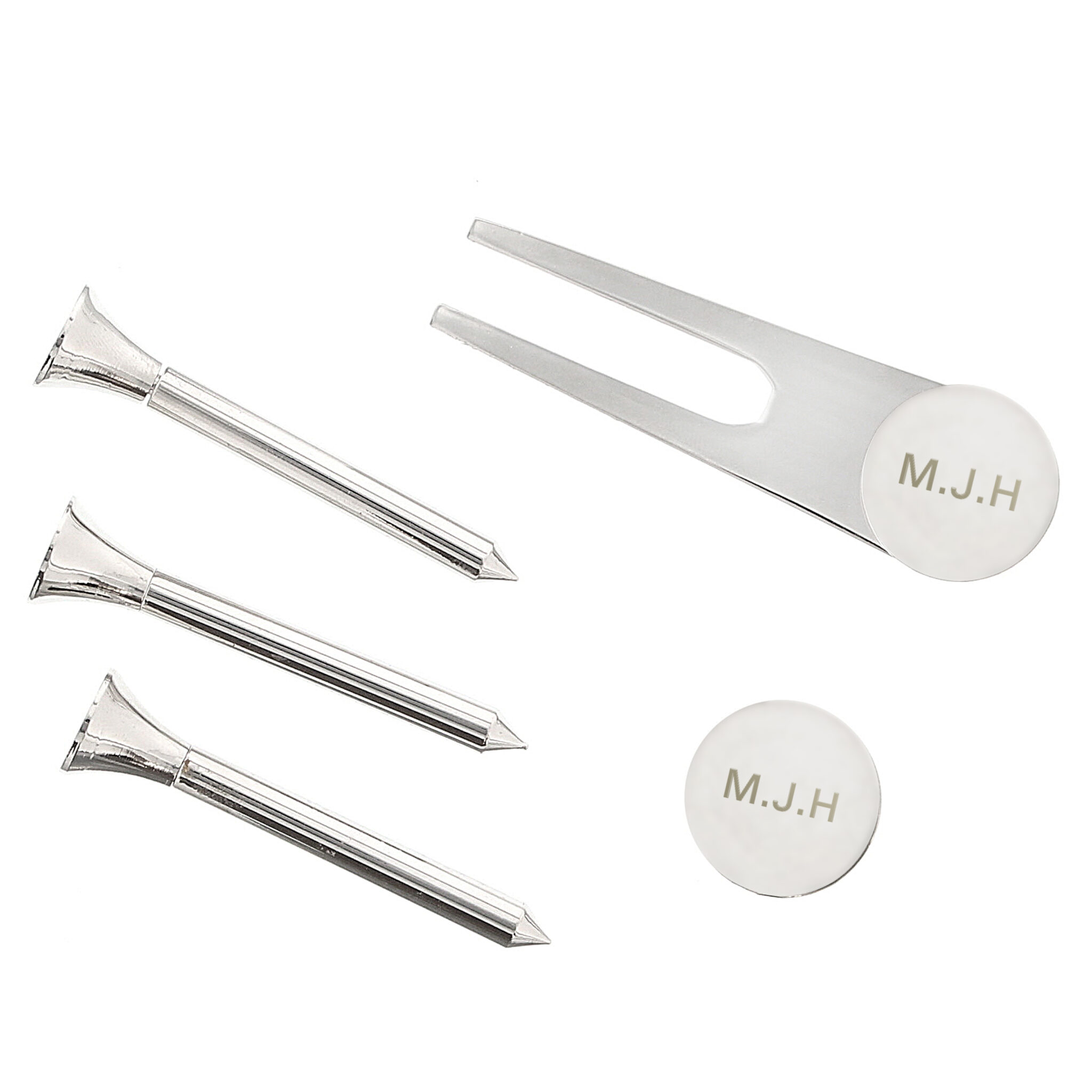- The set includes 3 tees, a pitch repairer with an attachable and detachable ball marker, and a spare ball marker.