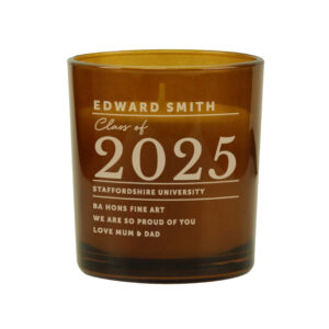 Our personalised amber glass vanilla scented candle jar is the perfect gift for commemorating a Graduation Crafted with elegance and durability in mind, this candle jar is not just a gift but a cherished keepsake.