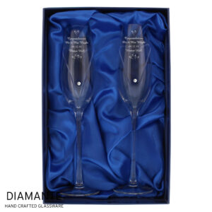 Personalise this Hand Cut Pair of Diamante Flutes with 4 lines, 15 characters per line.