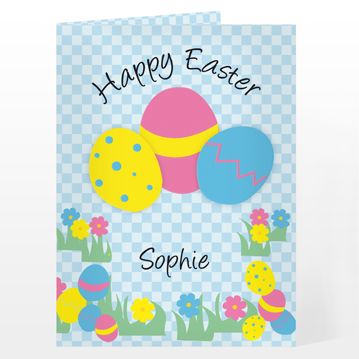Personalise this Easter Egg Card with any message of up to 20 characters above the Easter eggs and any name of up to 12 characters on the front.