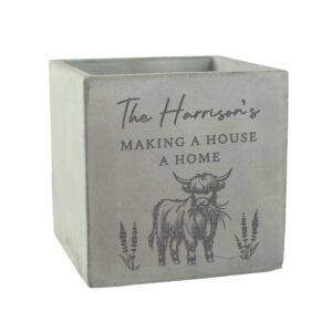- Featuring a sweet Highland cow design with your personal message above, it’s perfect for housing a potted plant or displaying dried or artificial flowers.