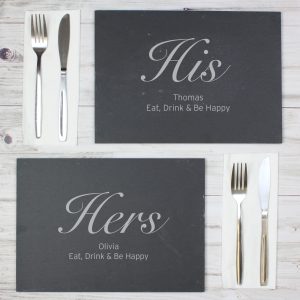 - The placemats can be personalised with 1 line of text up to 20 characters on the ‘his’ placemat and 1 line of text up to 20 characters on the ‘hers’ placemat.