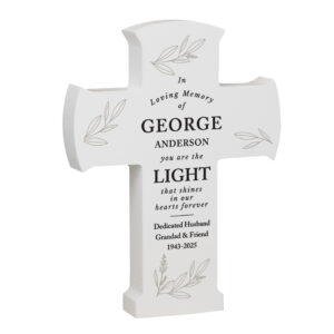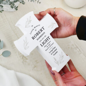 - Crafted with care, this elegant cross ornament can be personalised with a message over 5 lines, making it a truly personal tribute.