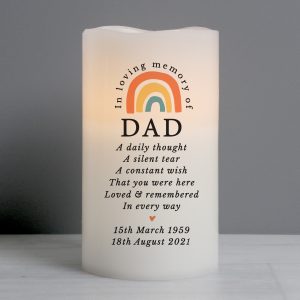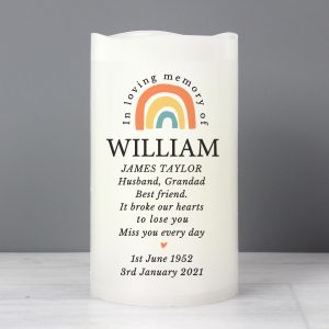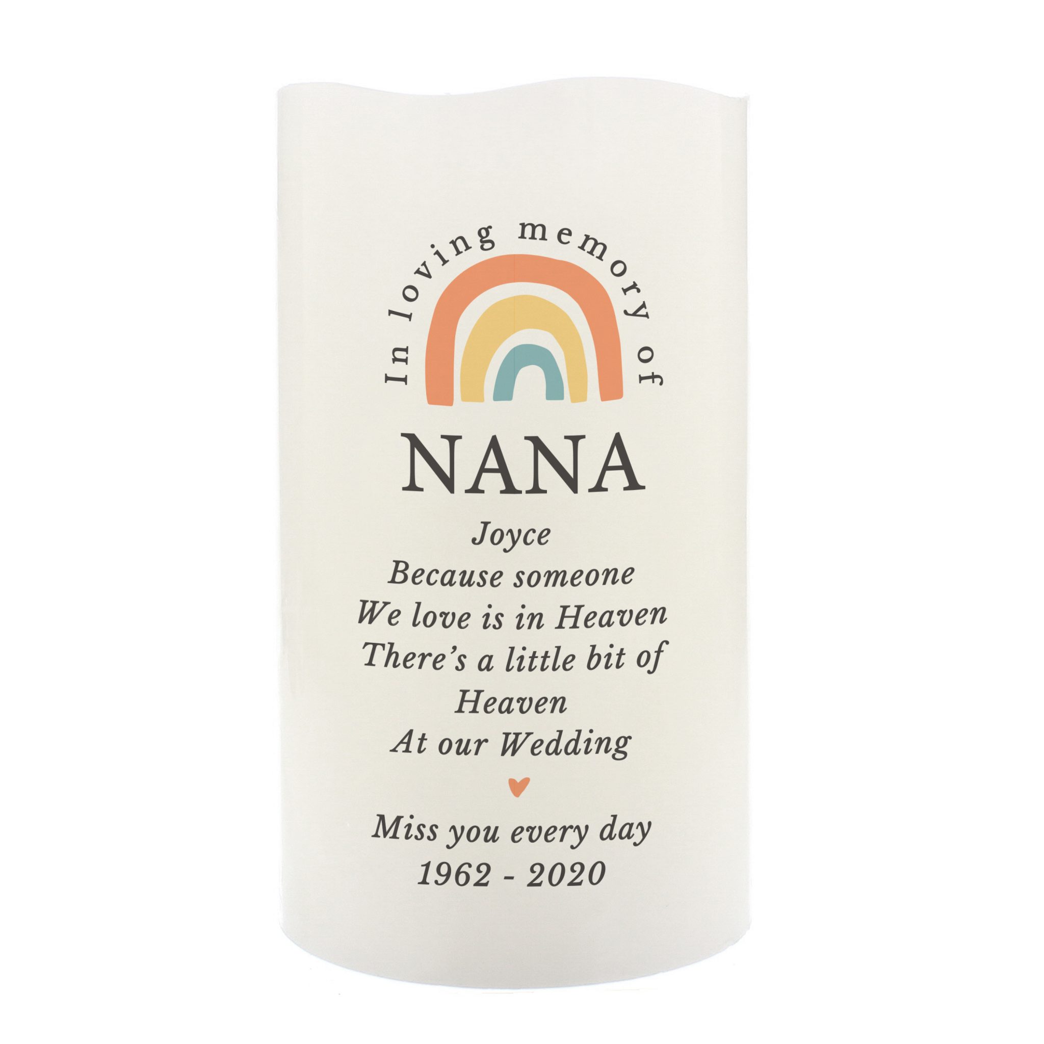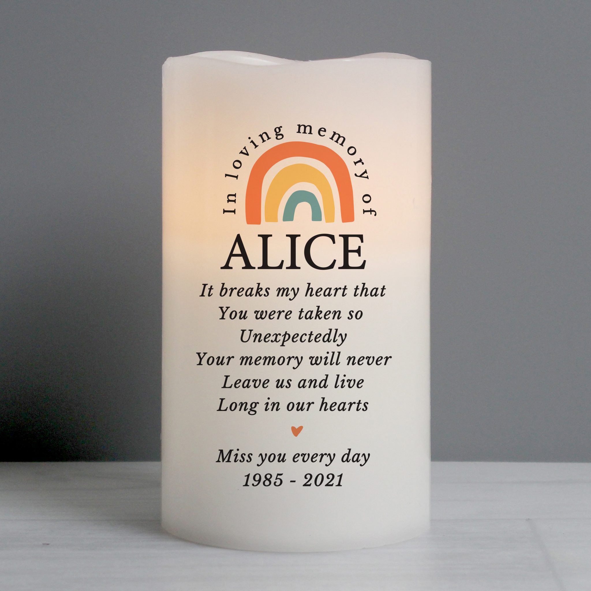 Message Line 8 – 25 characters The first line will appear in fixed uppercase, the rest will appear as entered. ‘In loving memory of’ is fixed text The LED candle has a flame effect and is coated in real wax. - Concealed at its base is the housing for the batteries.