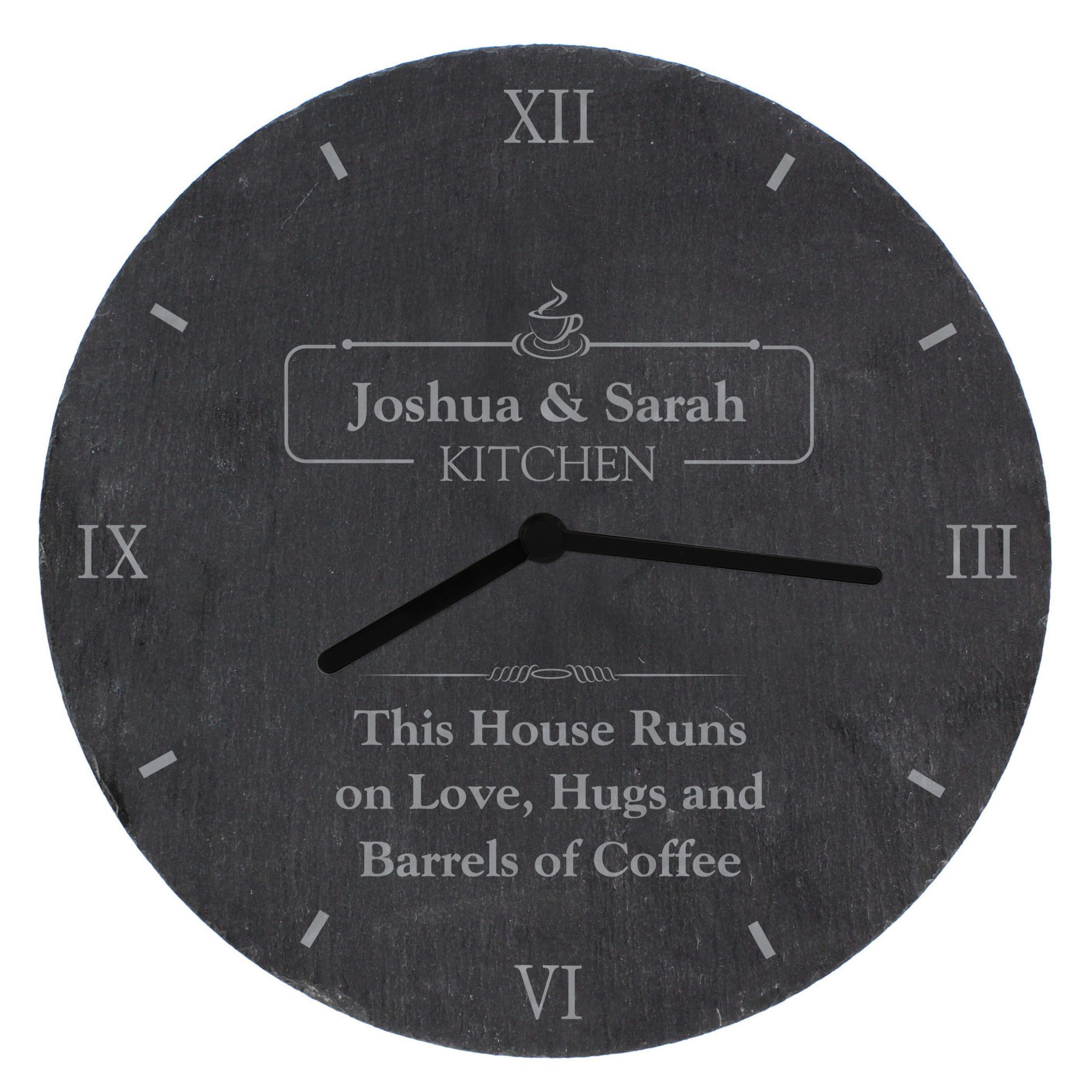 - You can personalise this slate clock with a name/s up to 18 characters long (which will appear inside the banner).