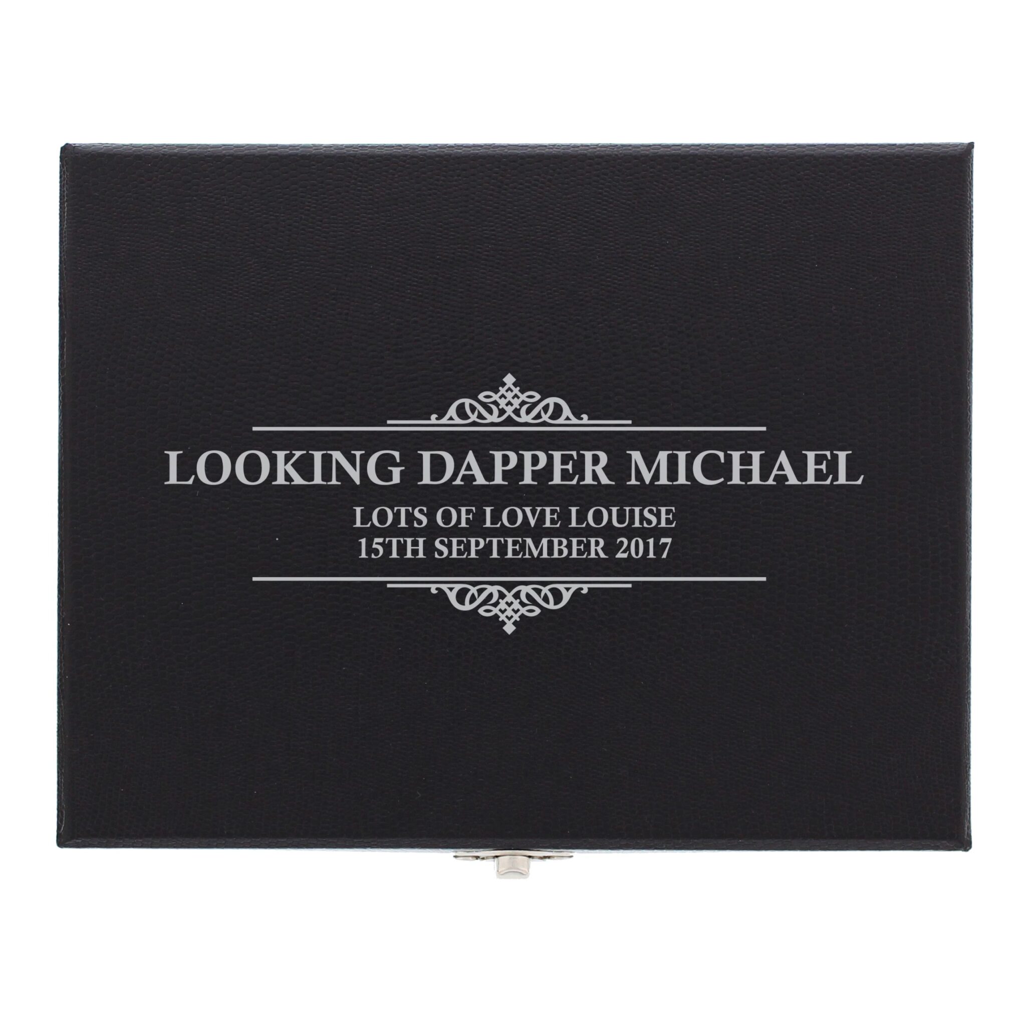This cufflink box can be personalised with a line of text up to 30 characters (appears in large letters) and 2 lines of text with up to 30 characters per line.