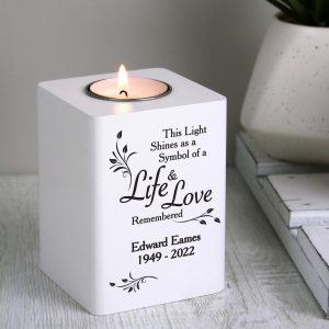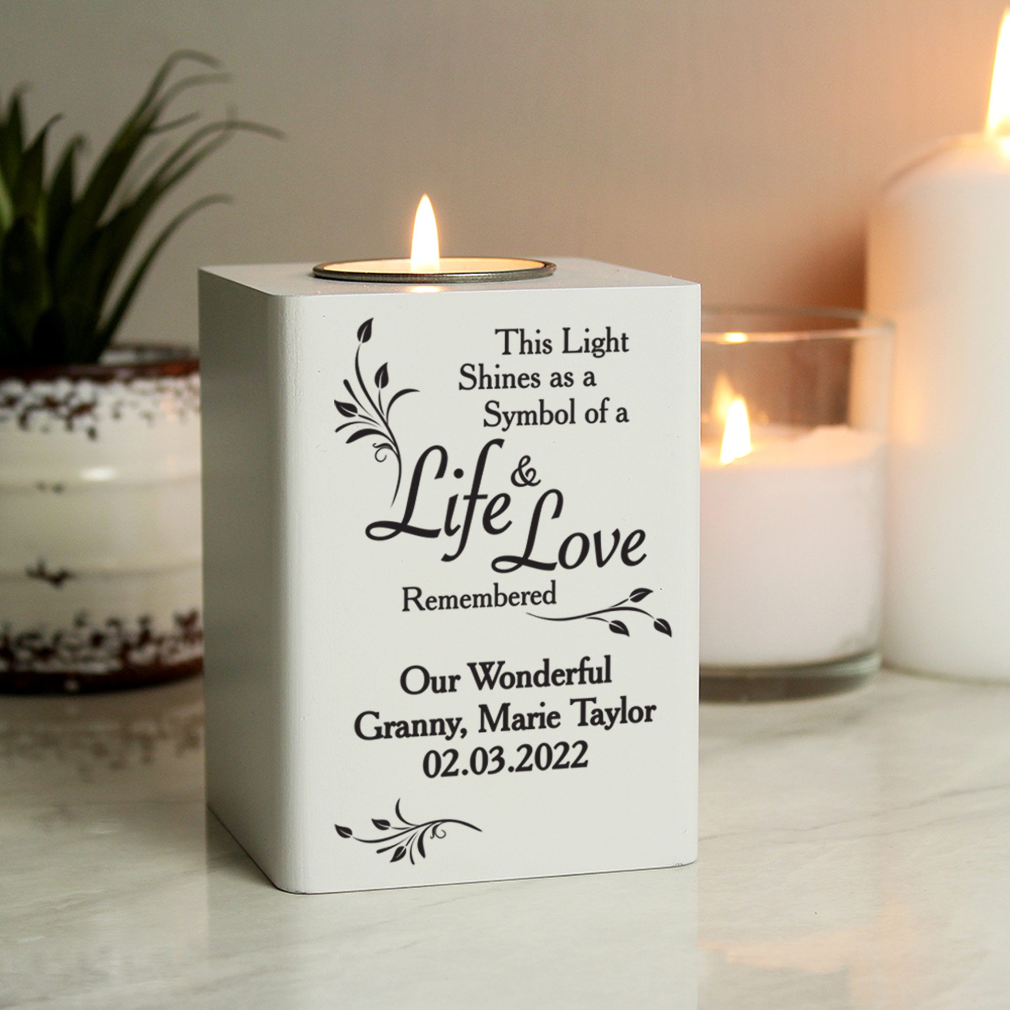 - Personalise this white wooden tea light holder with 3 lines with up to 20 characters per line.