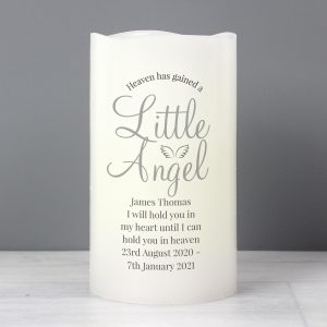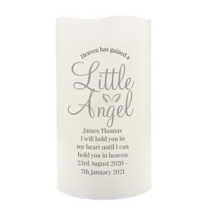 Message Line 6 – 30 characters Personalisation will appear as entered ‘Heaven has gained a little angel’ is fixed text The LED candle has a flame effect and is coated in real wax. - Concealed at its base is the housing for the batteries.