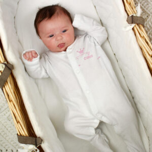 This adorable 100% cotton white baby grow has a little princess design followed by the babys name maximum 12 characters.