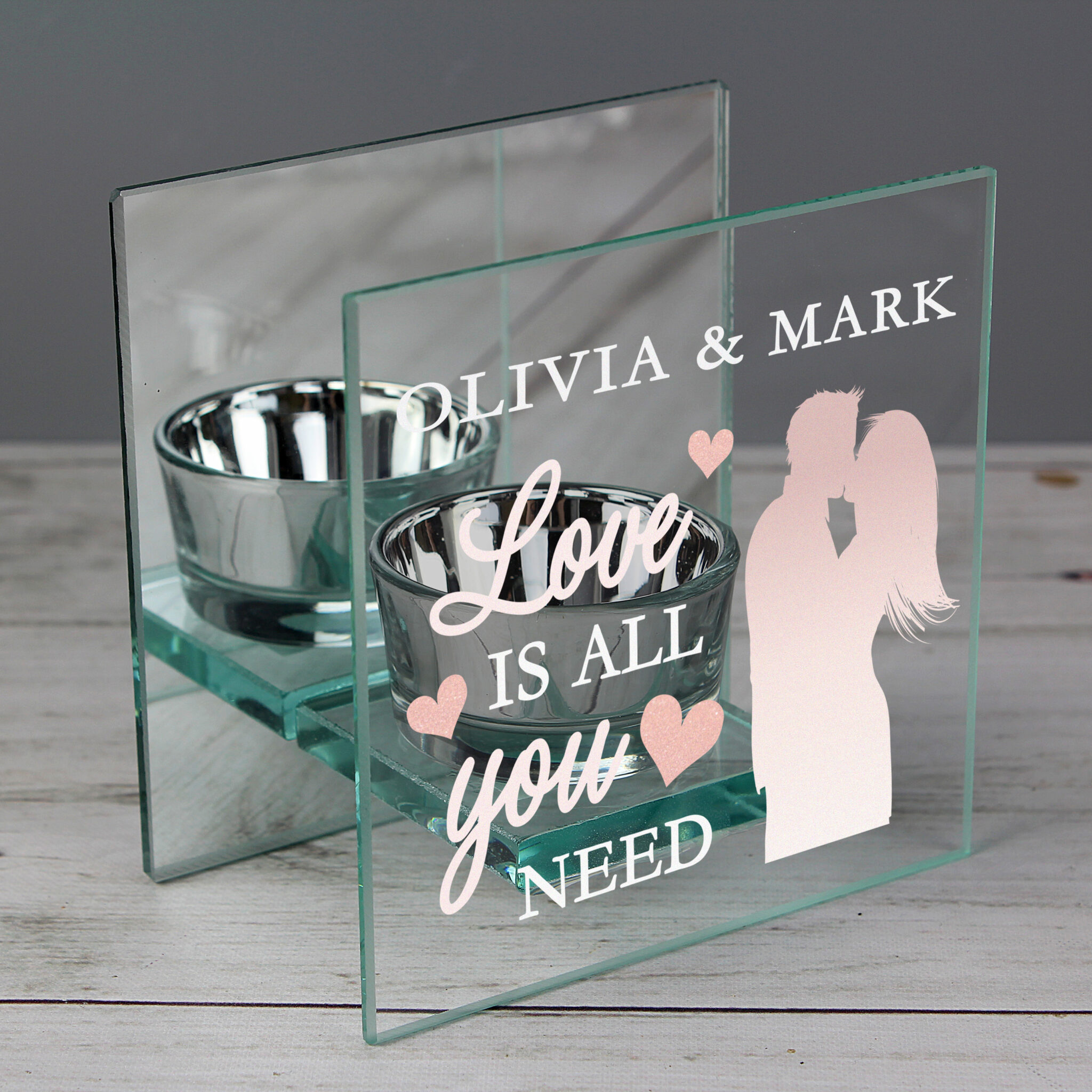 Personalised Love is All You Need Mirrored Glass Tea Light Candle Holder