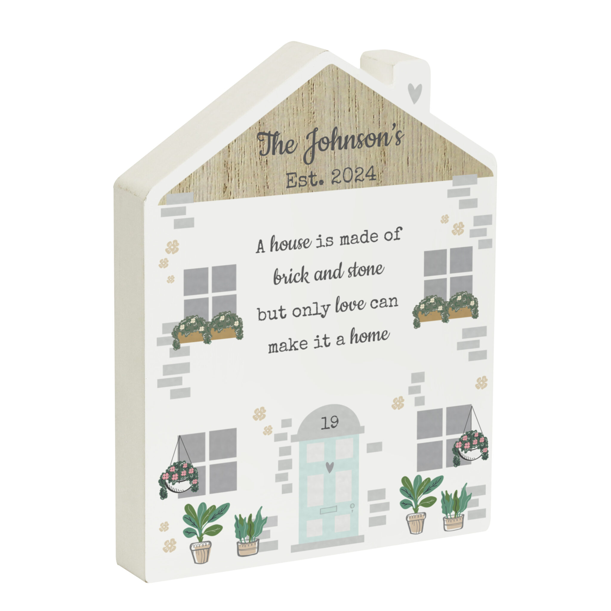 - Features the fixed text, “A house is made of brick and stone, but only love can make a home.” Please note, all personalisation is case sensitive and will appear as entered.