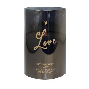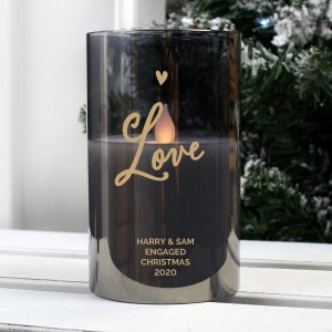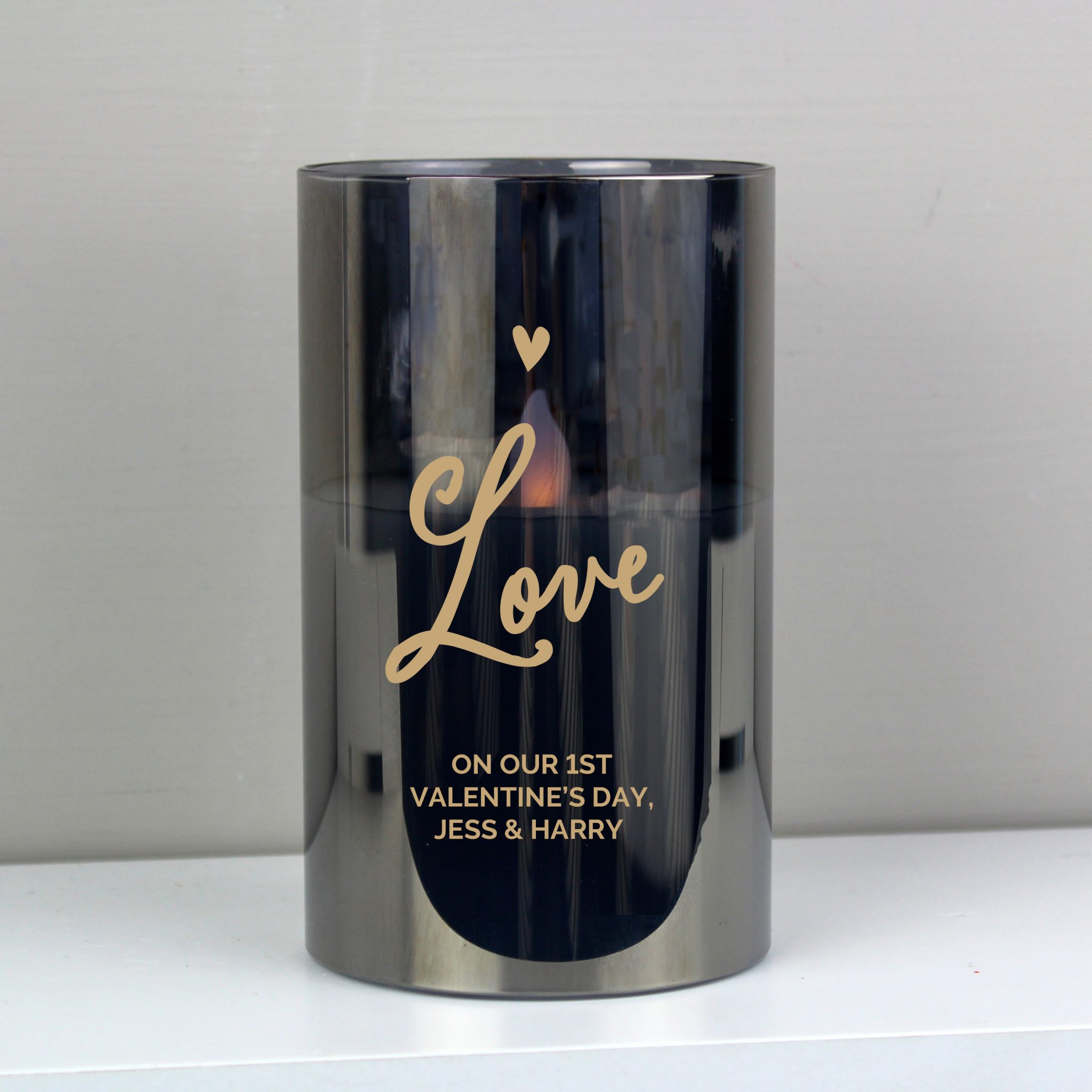 Line 3 – 20 characters available (Fixed uppercase) Line 4 – 20 characters available (Fixed uppercase) ‘Love’ is fixed text Frosted glass with wax LED candle and a life like effect amber flame. - Takes 2 AA batteries.