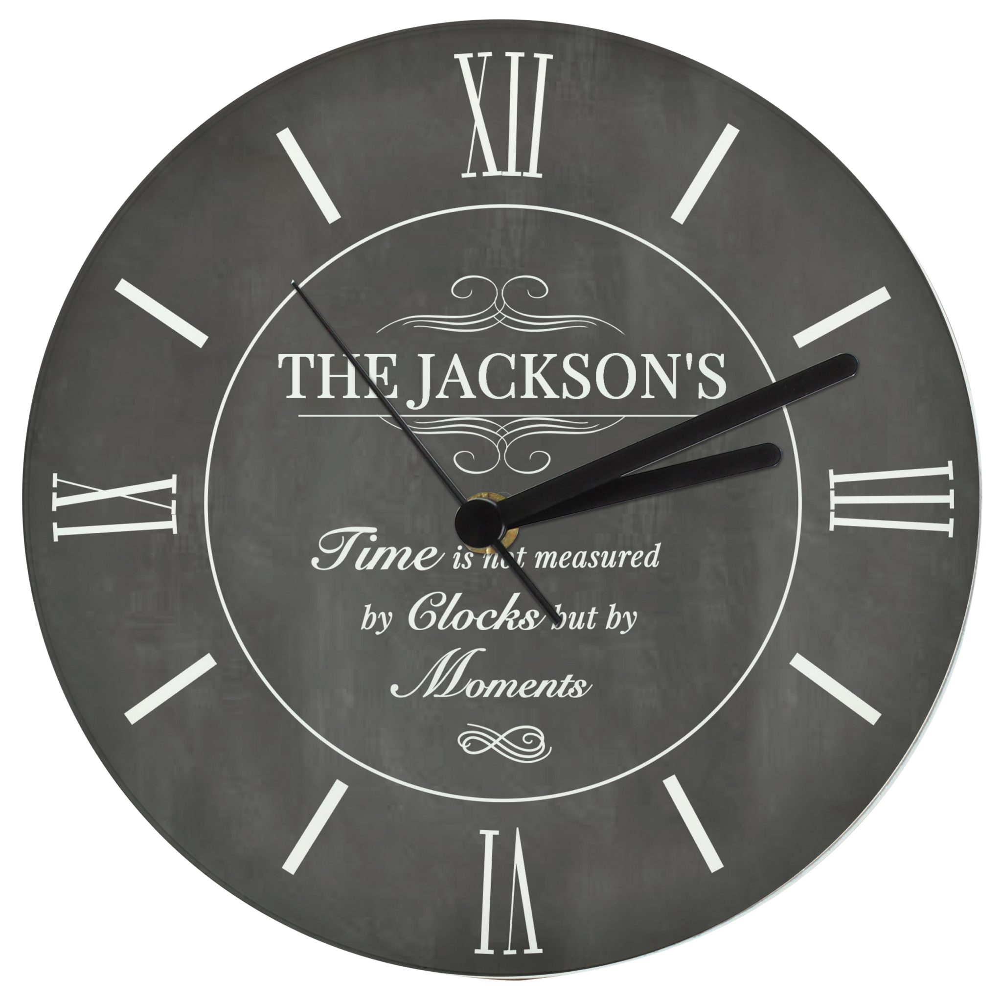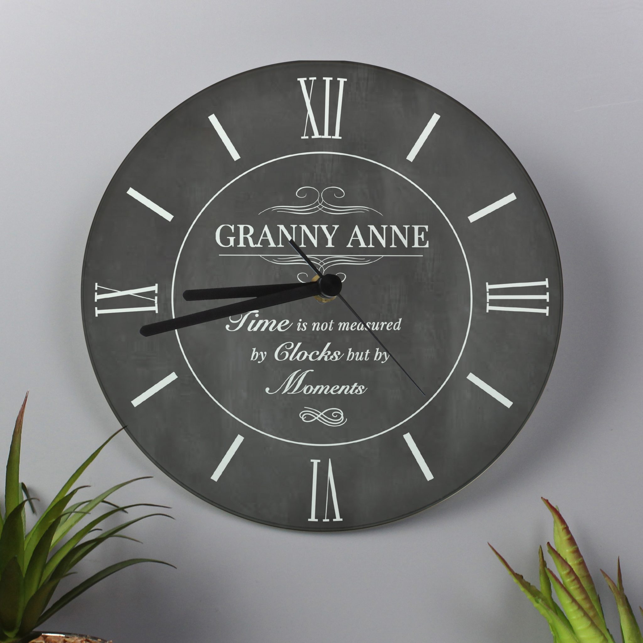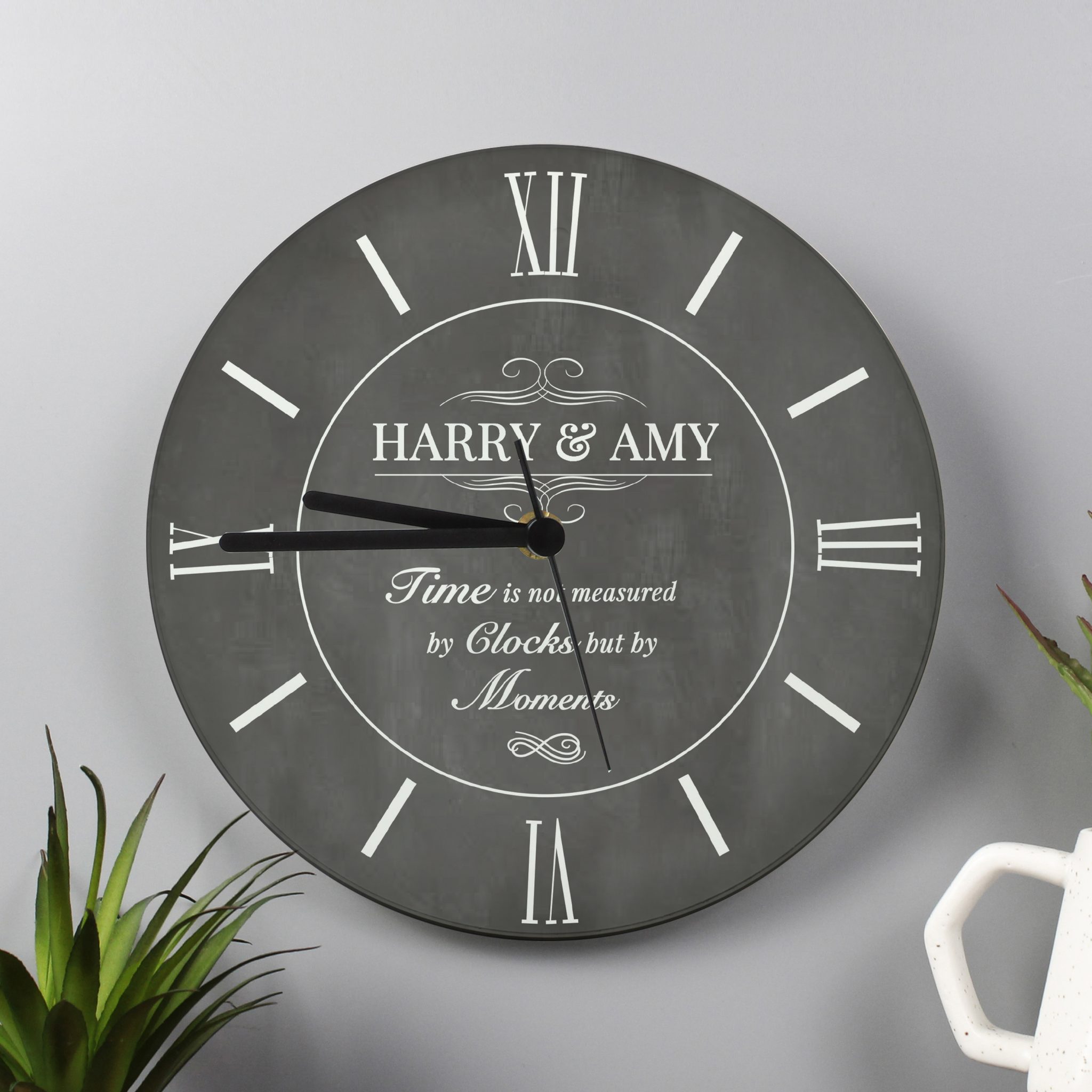 - Personalisation will appear in fixed uppercase. “Time is not measured in by clocks but by moments” is fixed text and cannot be changed.