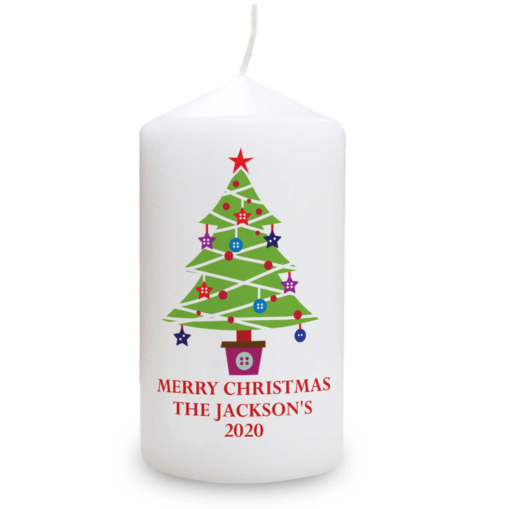 Personalise this Merry Christmas Tree Candle with a message over 3 lines of 15 characters each.