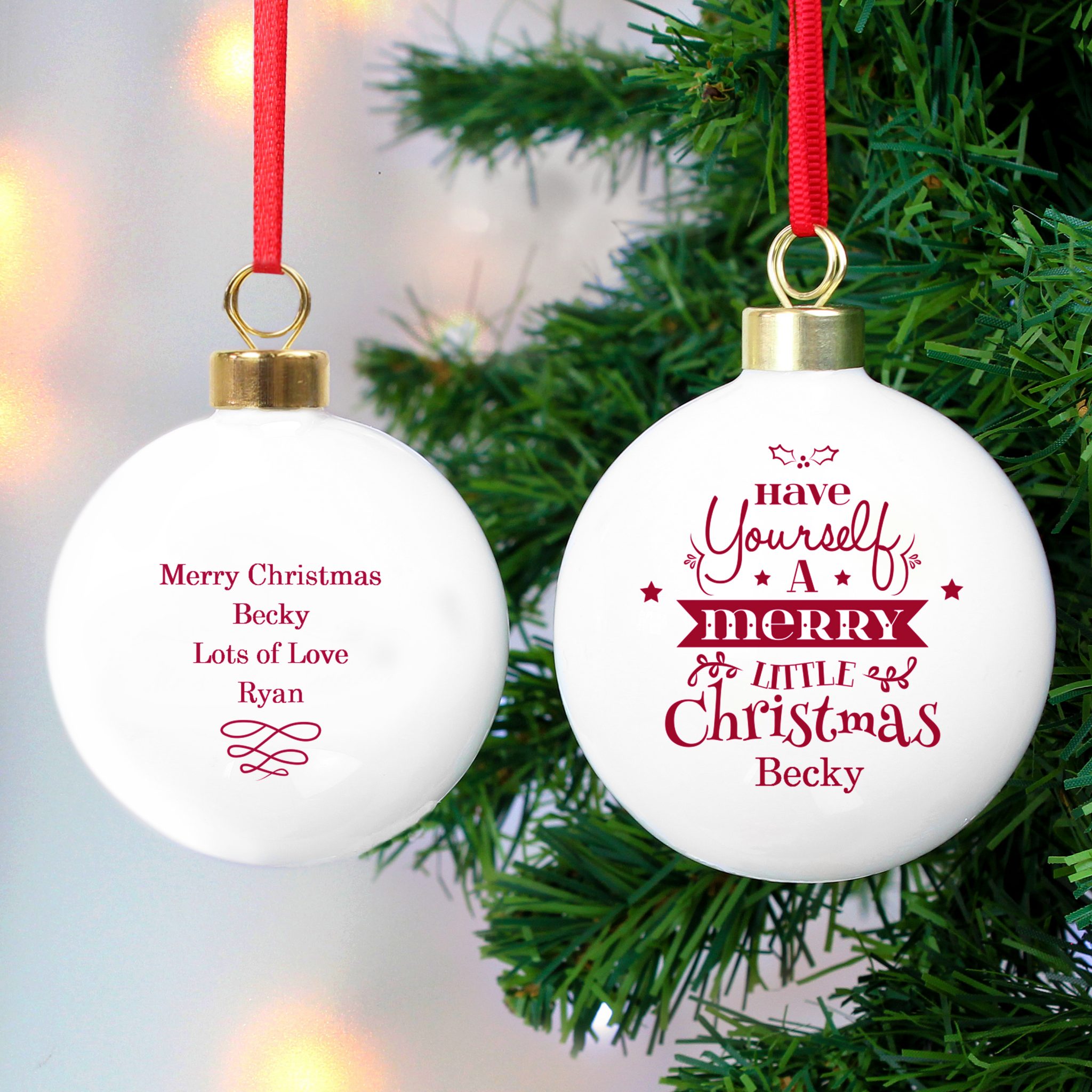Personalise this Have yourself a Merry Little Christmas Bauble with a name up to 15 characters and 4 lines of message on the reverse, 20 characters per line.