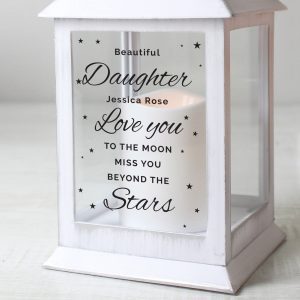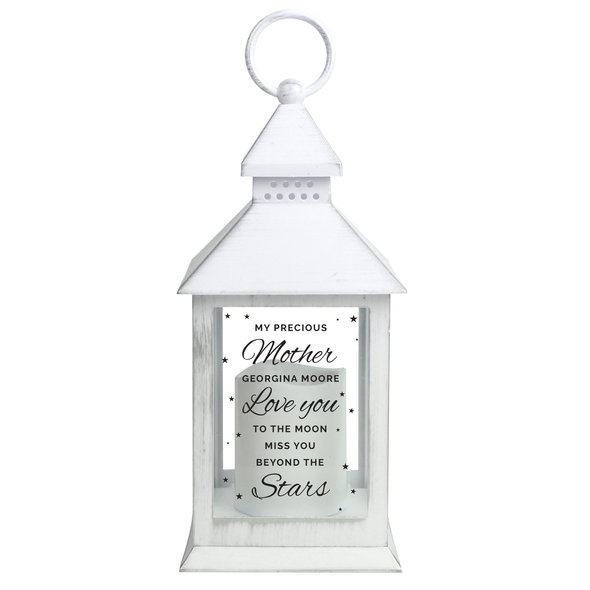 Line 3 – 20 characters available (Fixed Uppercase) ‘Love you too the moon, miss you beyond the Stars’ Fixed The battery-powered lantern has a realistic flickering warm orange flame effect, adding an ambient touch to any room. - The lantern is easy to hang around the home with the hoop attached.
