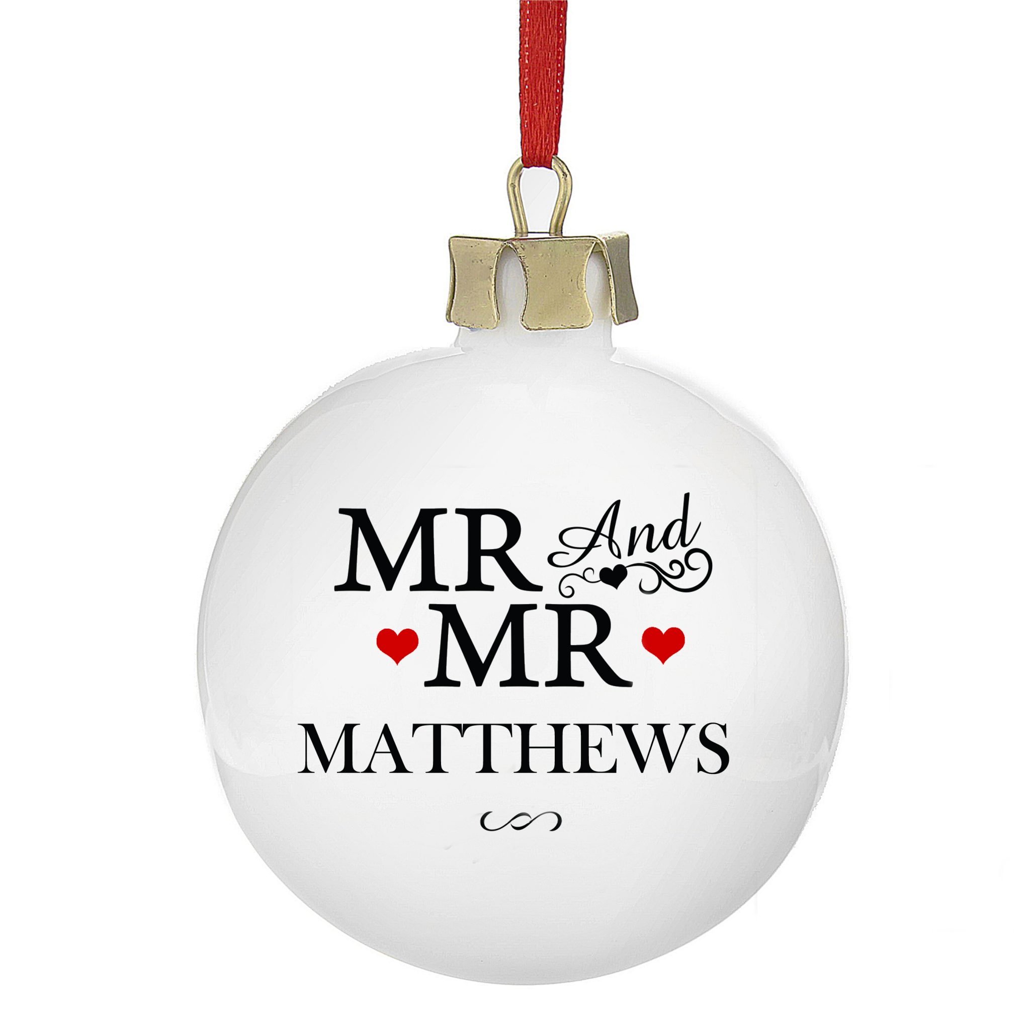 Personalise this Mr & Mr Bauble with a surname up to 15 characters and a further 4 lines of 20 characters each on the reverse of the bauble.
