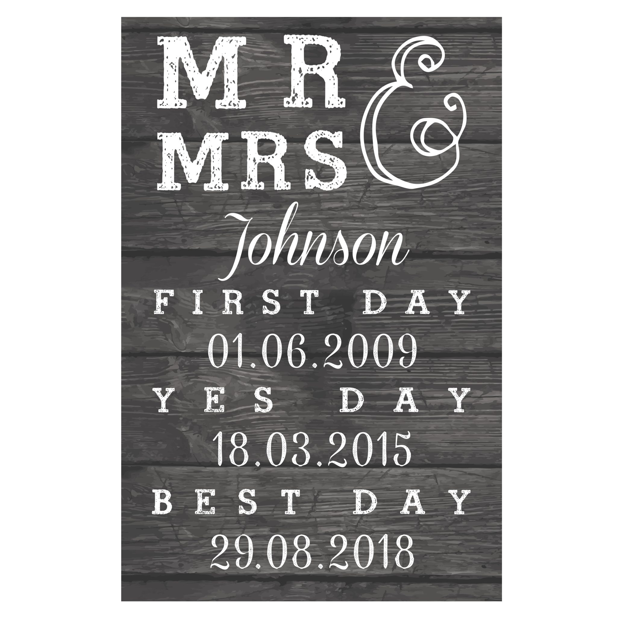 - Please note the words ‘Mr & Mrs’, ‘ First Day’ ‘Yes Day’ and ‘Best Day’ are fixed text.