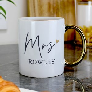Perfect for weddings and teacher gifts alike, this personalised Mrs gold handled mug combines timeless style with a thoughtful personal touch.