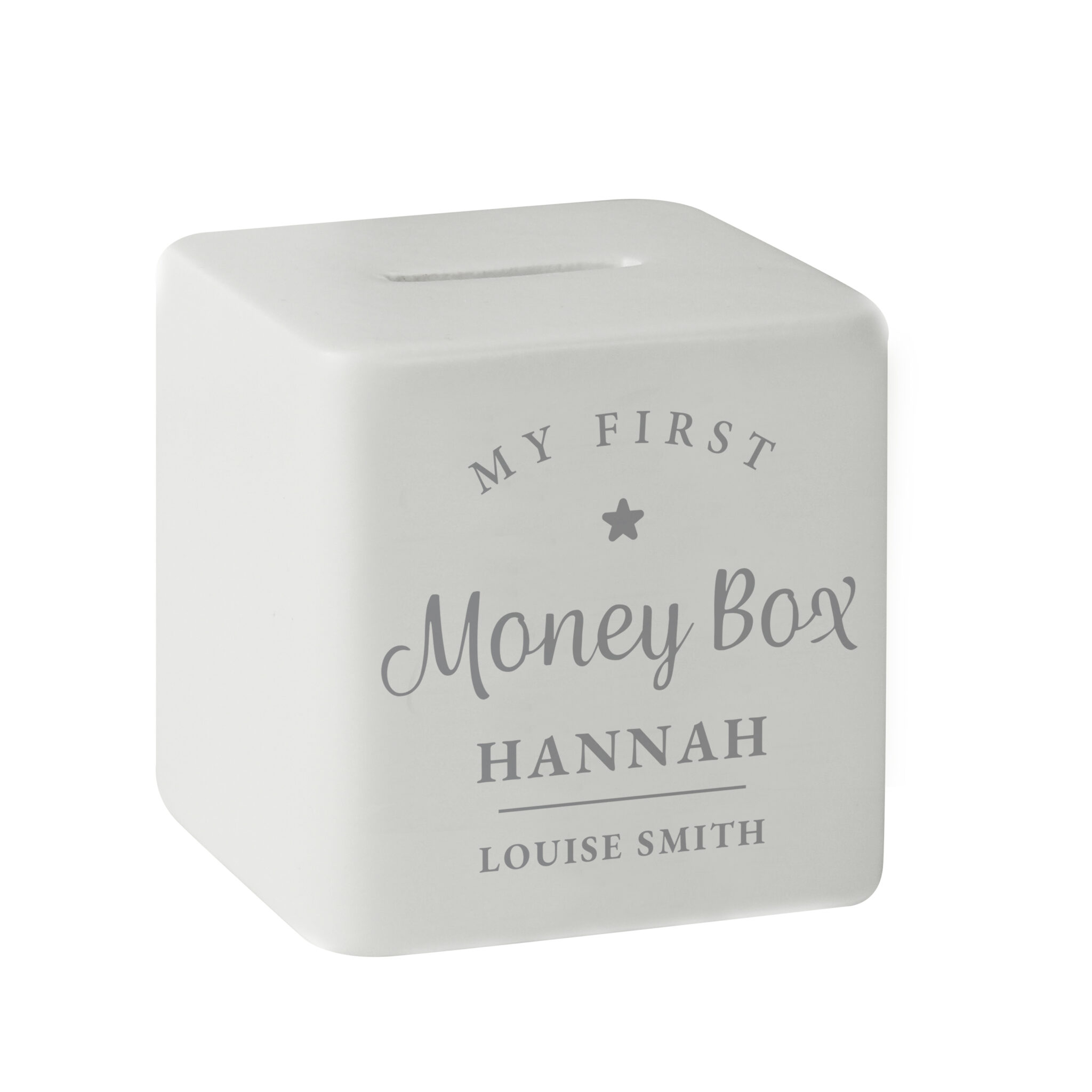 Line 2 – up to 20 characters The personalisation will appear in fixed upper case. “My first money box” is fixed text and cannot be changed. - Material is ceramic These money boxes are hand finished and are subject to some imperfections.