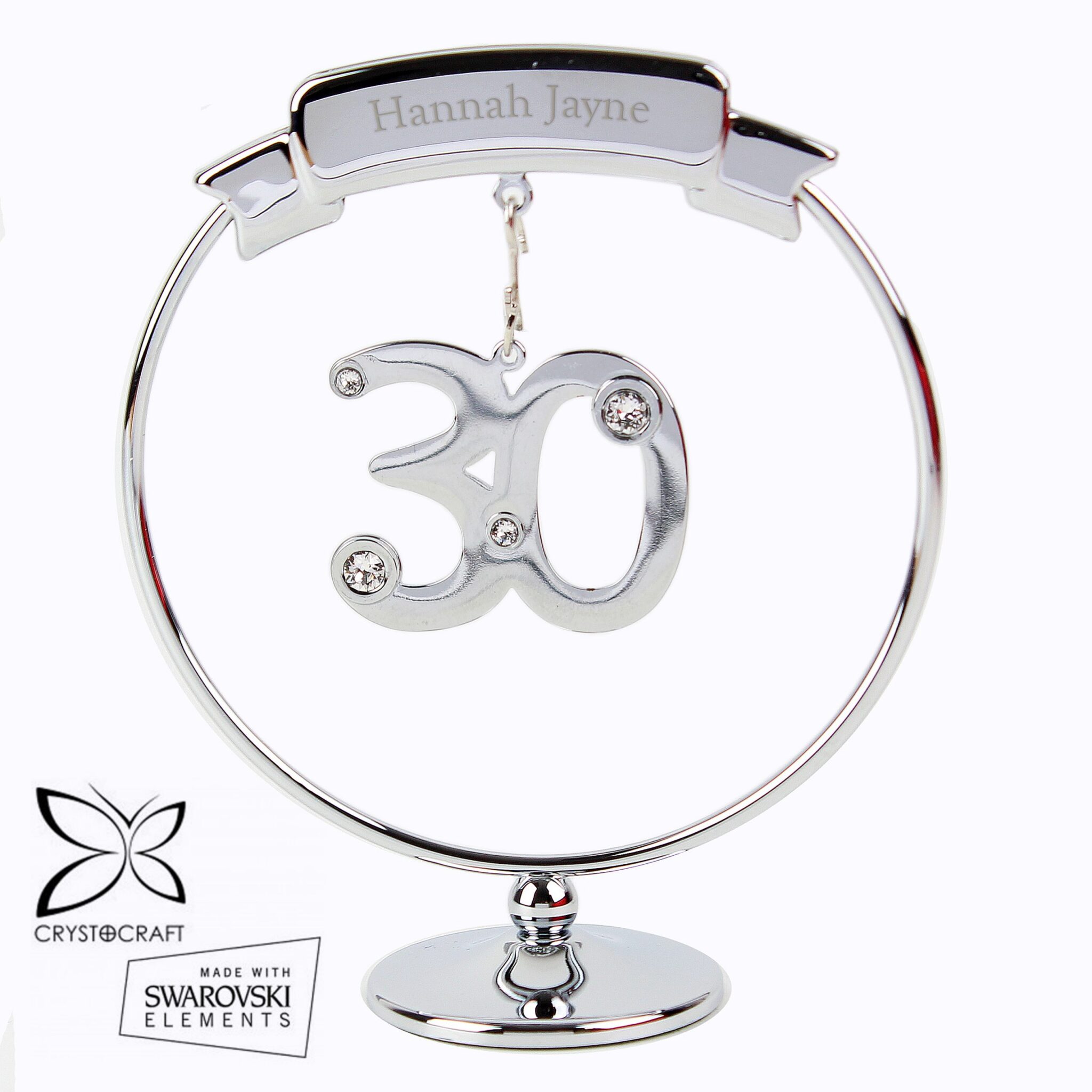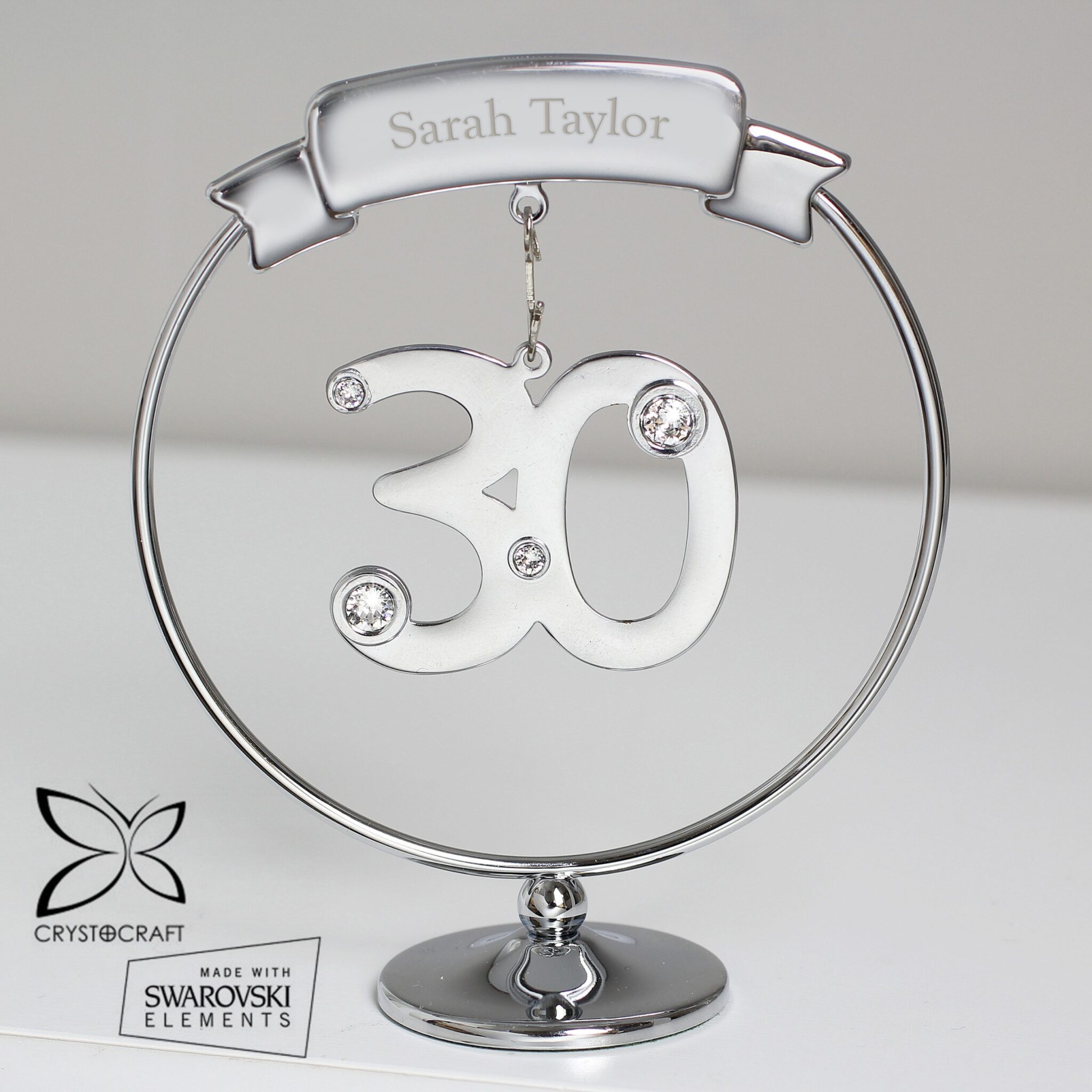 Dangling from a personalised round silver stand is a crystal clad 30 piece. This will catch the light and bring a smile to the recipients face.