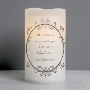 Personalise the Ornate Frame LED candle with up to 5 lines of 20 characters of personalisation.