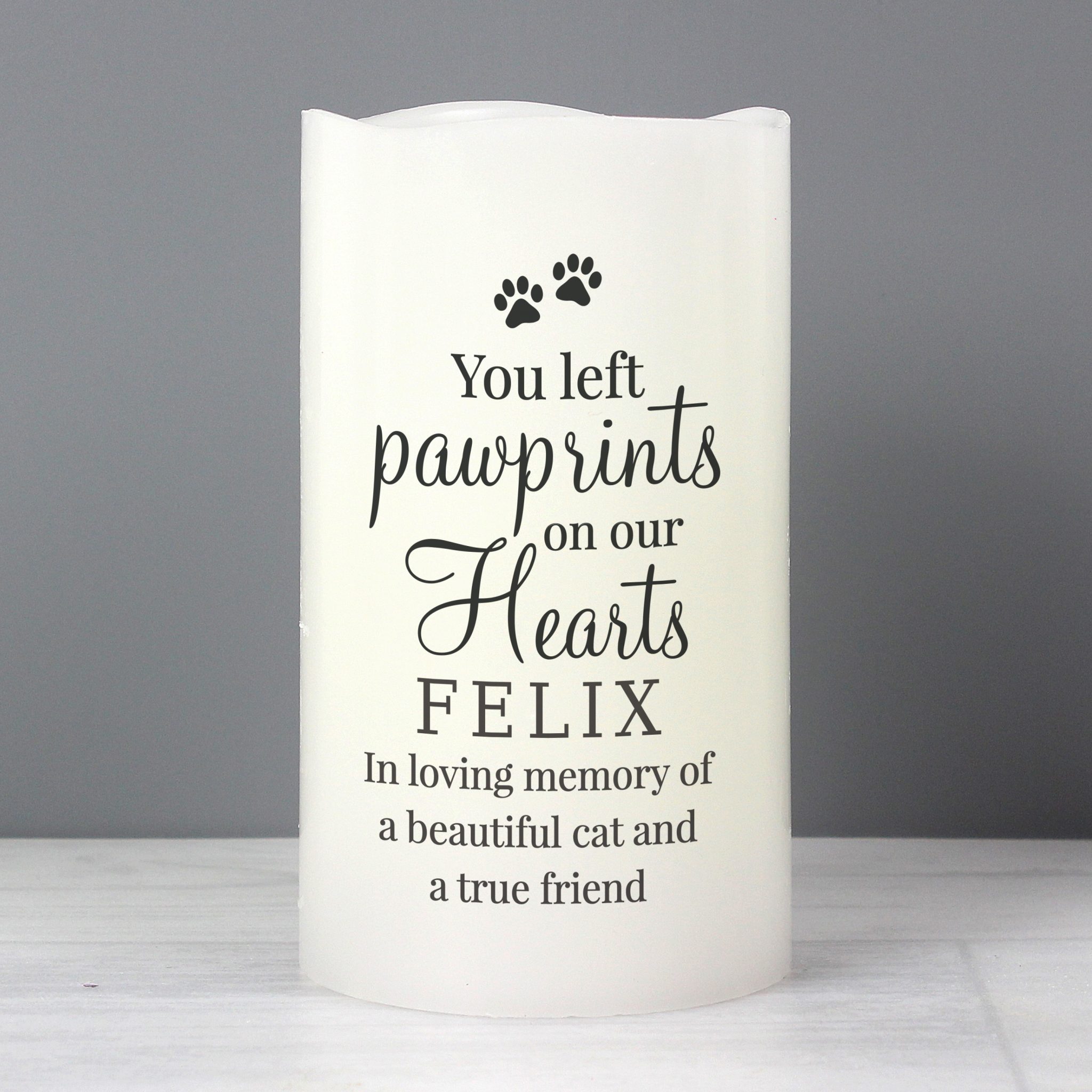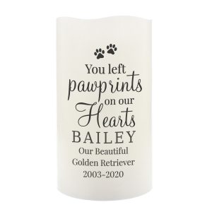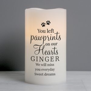 Message Line 3 – 20 characters The first line will appear in fixed uppercase, the rest will appear as entered. ‘You left pawprints on our hearts’ is fixed text The LED candle has a flame effect and is coated in real wax. - Concealed at its base is the housing for the batteries.
