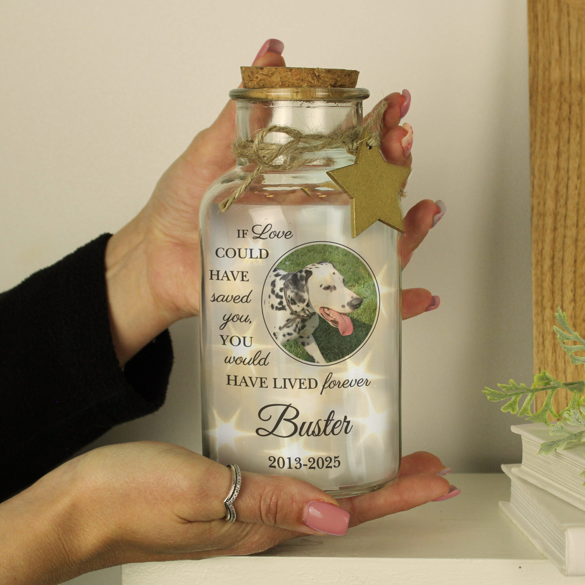 Celebrate the life and cherished memories of your beloved pet with our Personalised Pet Memorial Photo Upload LED Light Up Jar Featuring the fixed text, “If love could have saved you, you would have lived forever”, this unique and heartfelt keepsake is the perfect way to honour the bond you shared with your pet.