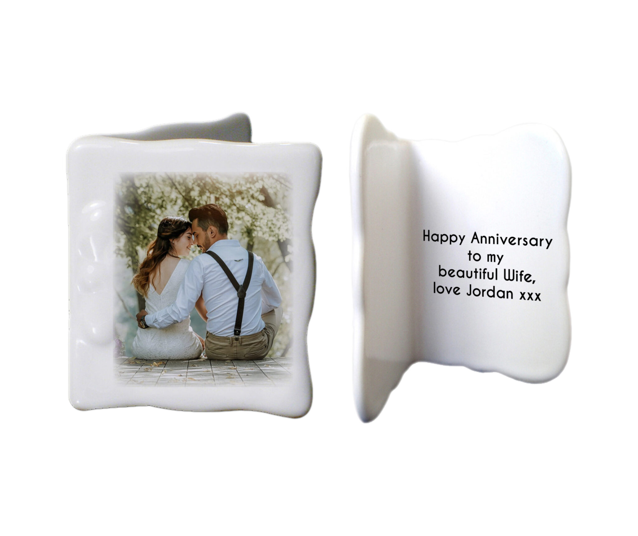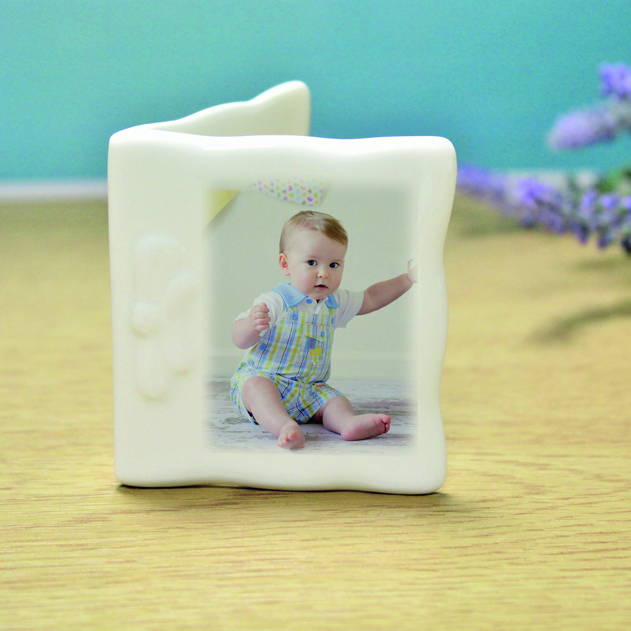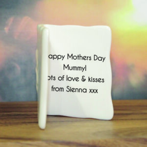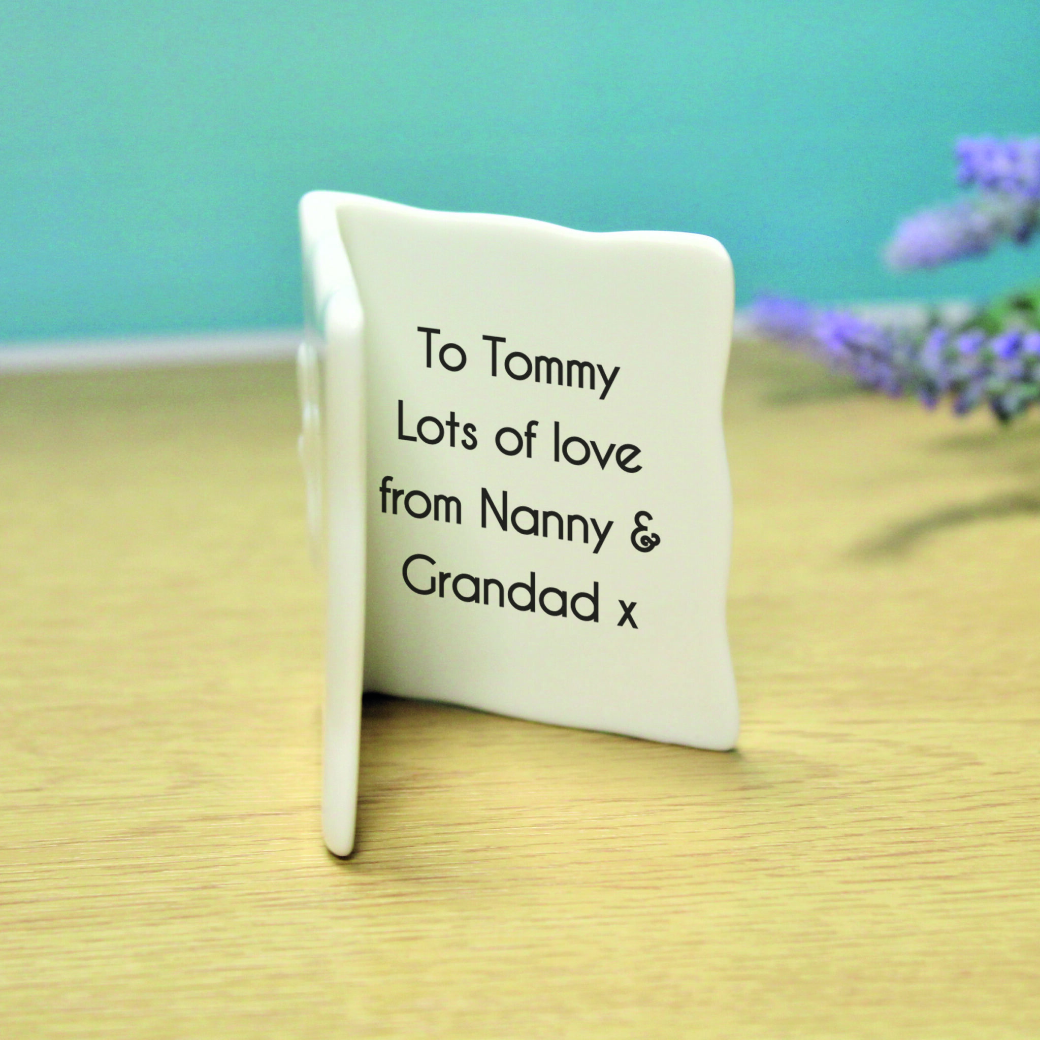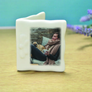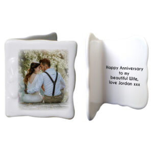 Add your own photo to sit on the front of this mini bone china message card. Your sentiment is fired on the inside over 4 lines of 25 characters. The card is 6cm tall and 4cm wide.