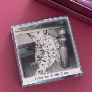 Personalise this beautiful jade glass block with a special photo and a message of up to 30 characters. It is the perfect gift for any occasion. The solid glass box comes in a presentation box and is 8cm high, 8 cm width and 2cm wide.