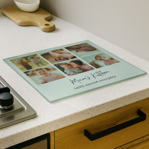- You can personalise this glass chopping board with 6 photos and 2 lines of text.