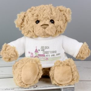 This cuddly teddy with T-shirt features a cute pink church design that can be personalised with a name occasion and date (12 characters per line) (on your is standard)