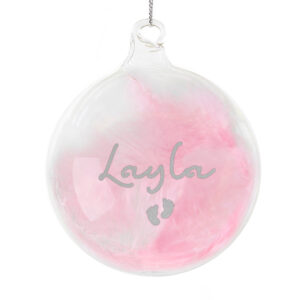 This Personalised Pink Feather Silver Feet Glass Bauble will make a stunning addition to the Christmas tree or to celebrate the birth of a baby girl!