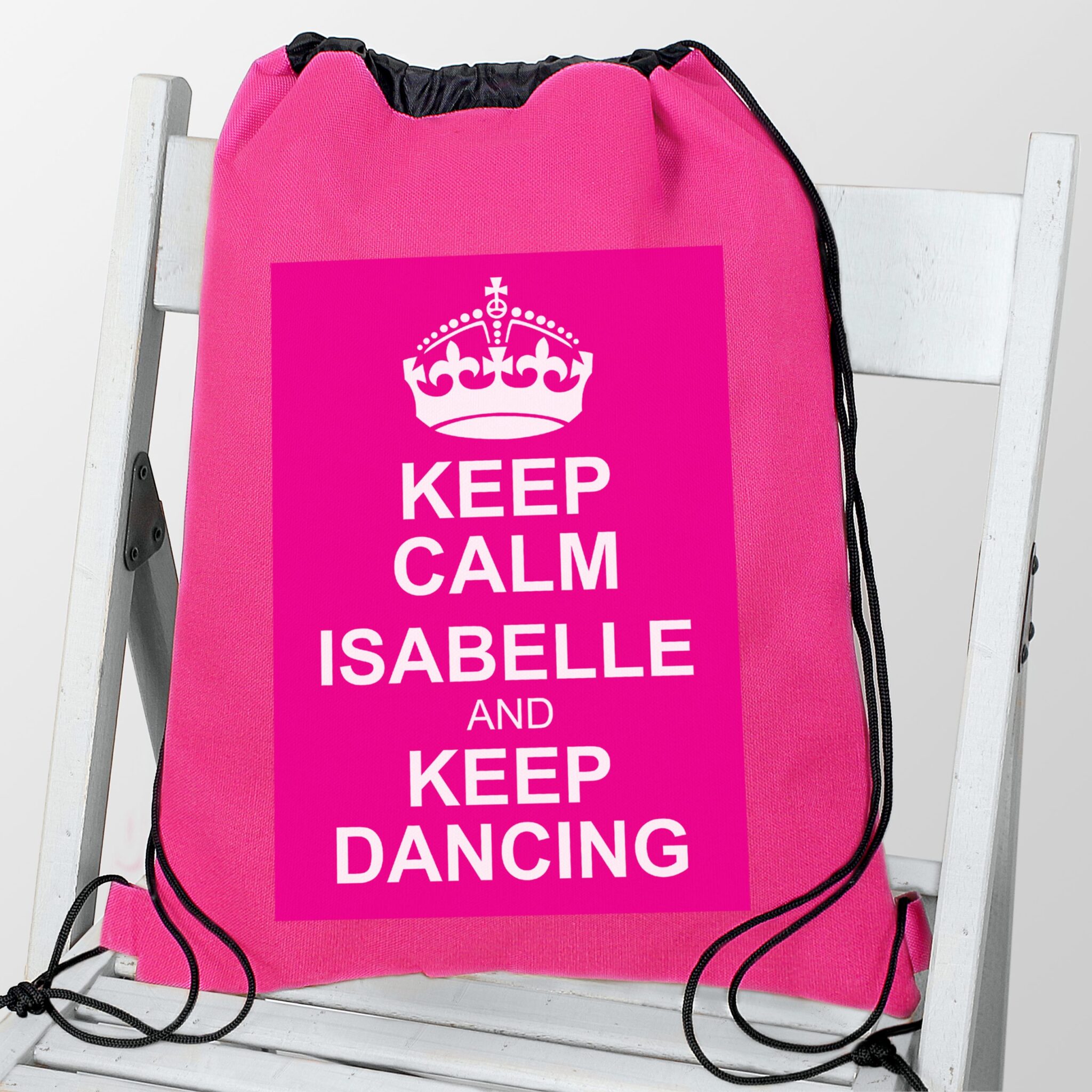 Personalise this Pink Keep Calm Kit Bag with a name using up to 12 characters and two lines of message using up to 15 characters, e.g. ‘Keep Dancing’, ‘Keep Calm’ and ‘and’ are fixed text.