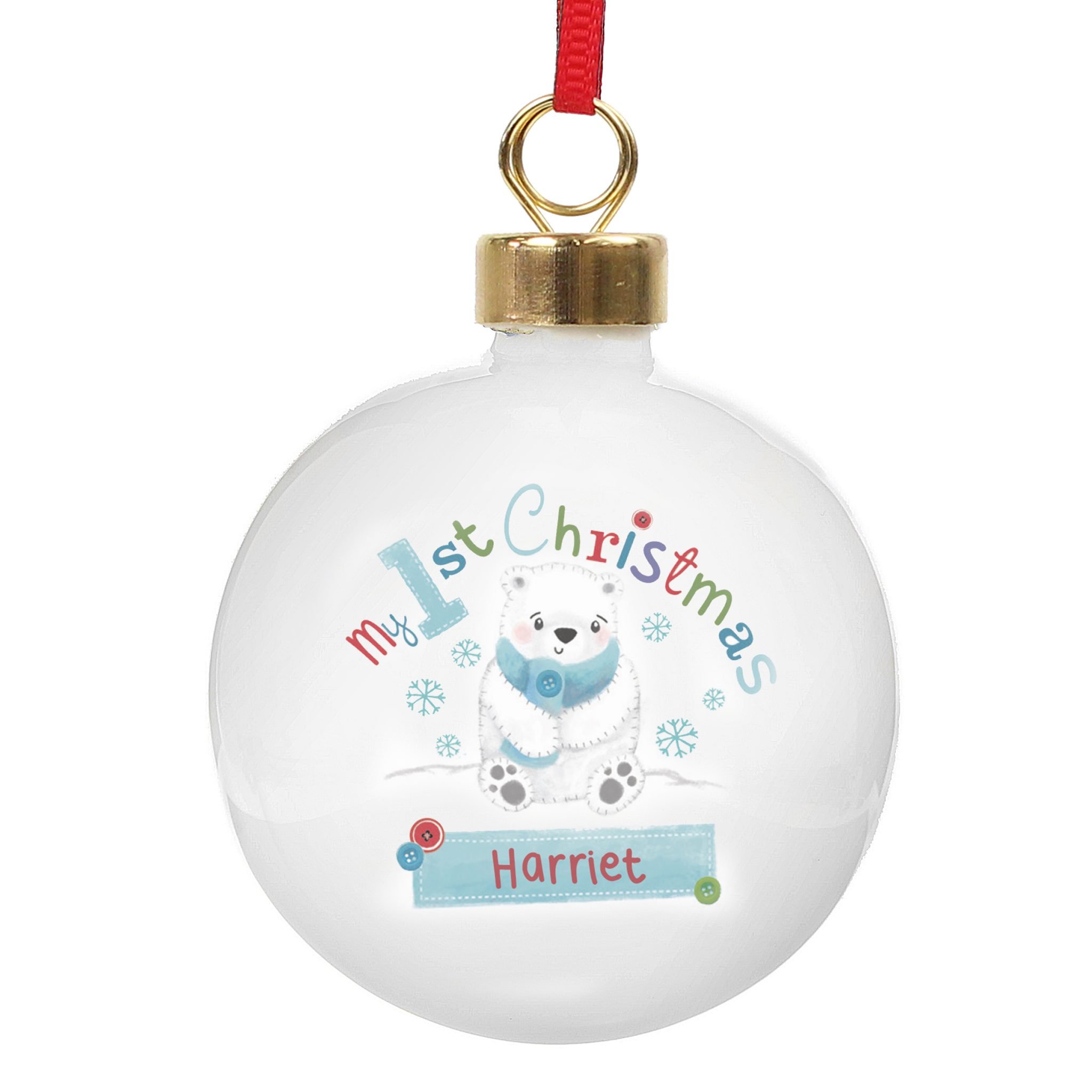 Personalise this Polar Bear My 1st Christmas Bauble with a name up to 12 characters on the front and any message you choose on the reverse over 4 lines and up to 15 characters per line.