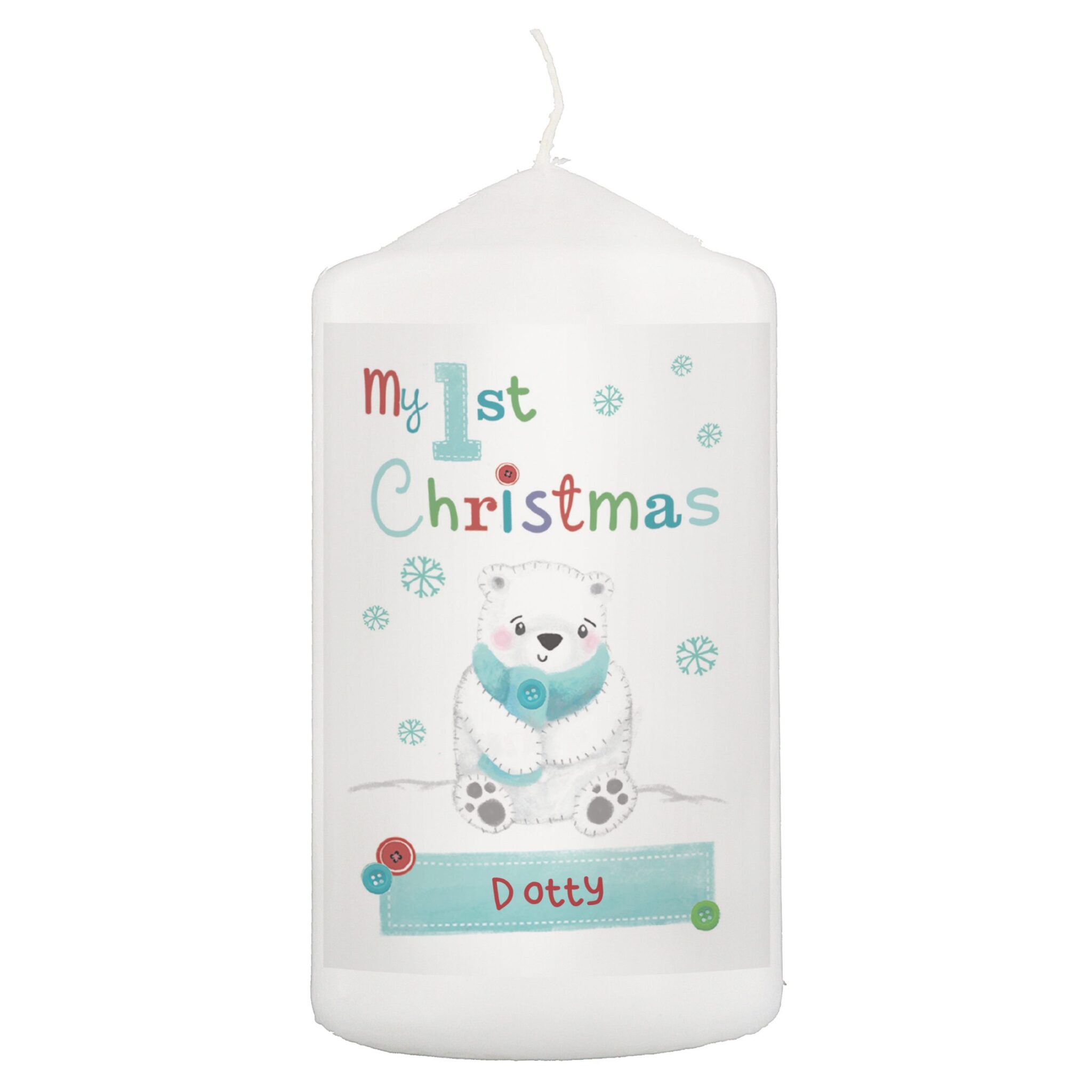 Personalise this Polar Bear My 1st Christmas Candle with a name up to 12 characters.