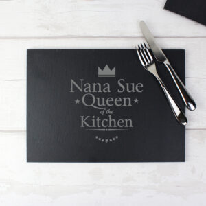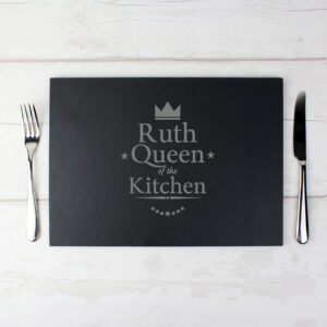 Personalise this Queen of the Kitchen Slate Rectangle Placemat with a name of up to 12 characters that features at the top of the design.