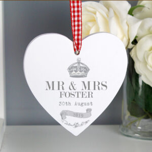 Personalise this Royal Crown Wooden Heart Shaped Decoration over lines 1 & 2 of up to 12 characters per line.