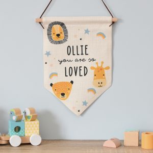 Personalise this cute linen hanging banner with a name up to 12 characters long above the fixed quote “You are so loved.” Please note – the name will appear in capitals due to the font.