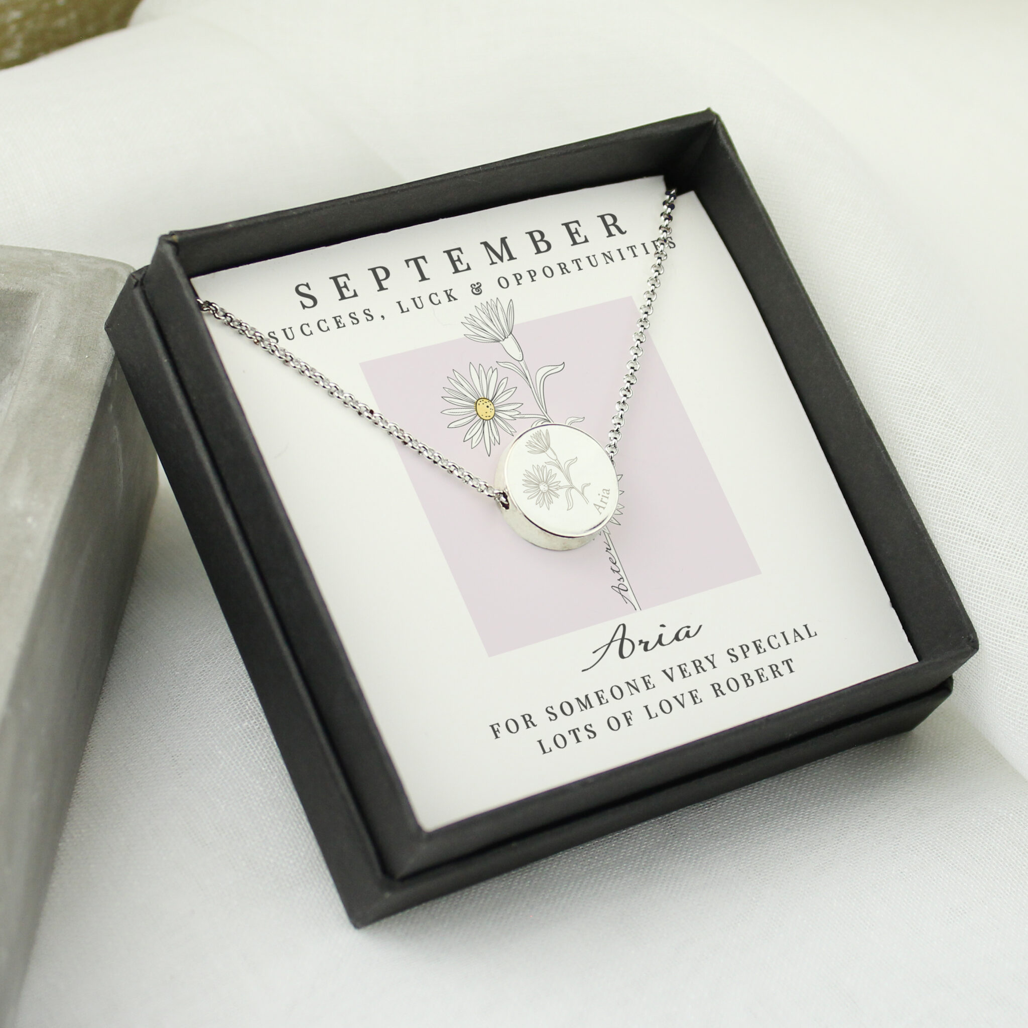 Personalised September Birth Flower Necklace and Box