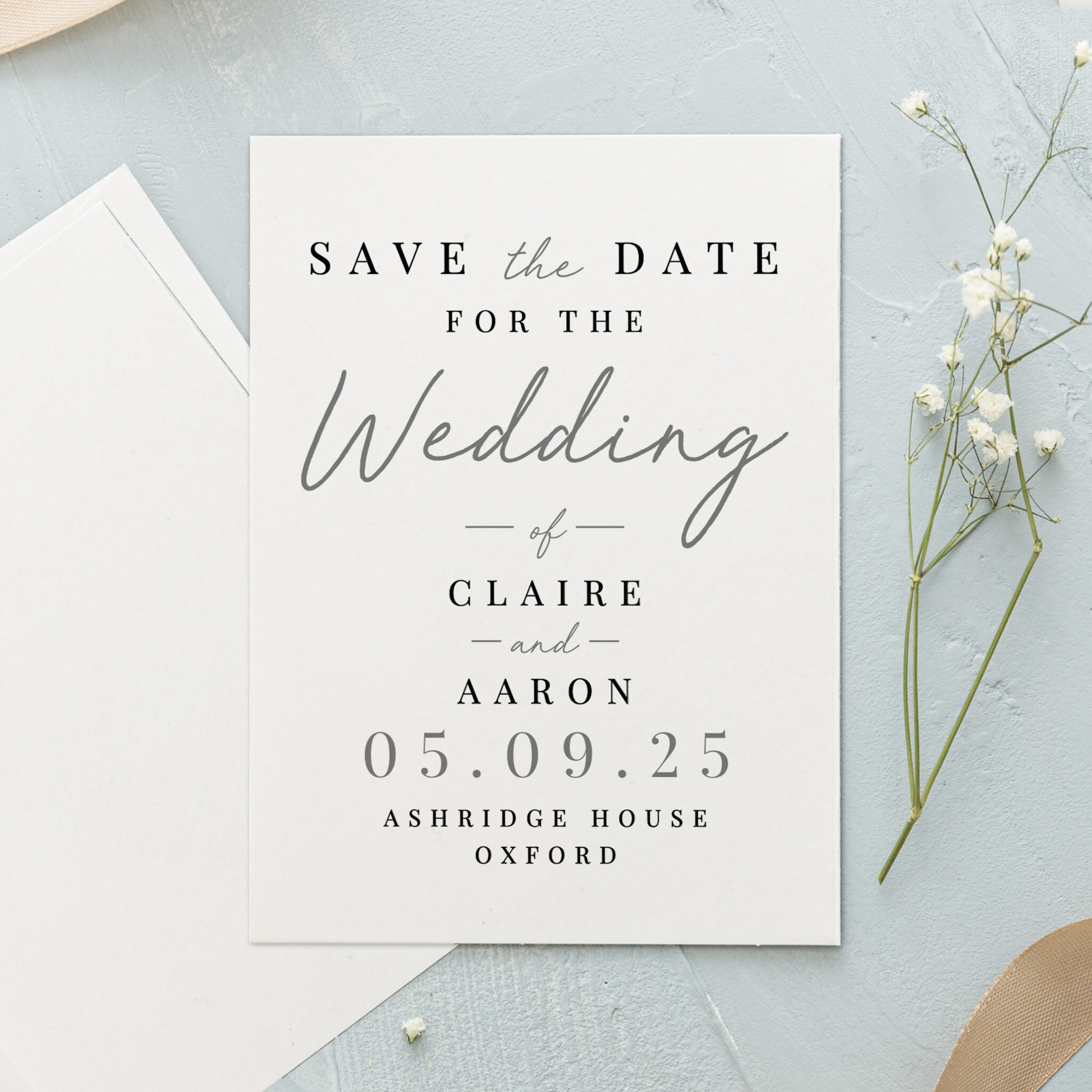 - Add your own personalised touch with your own text over 5 lines as below, to sit beneath the fixed text, “Save the date for the Wedding of” Line 1 – 20 characters