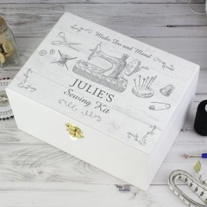 - This wooden keepsake box is ideal for storing all manner of sewing materials, including scissors, a measuring tape, cotton spools, needles and thimbles.